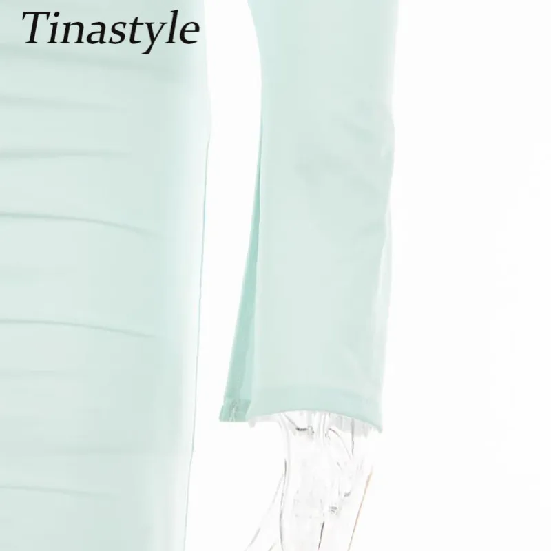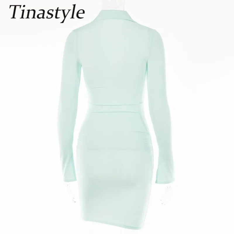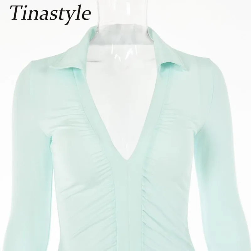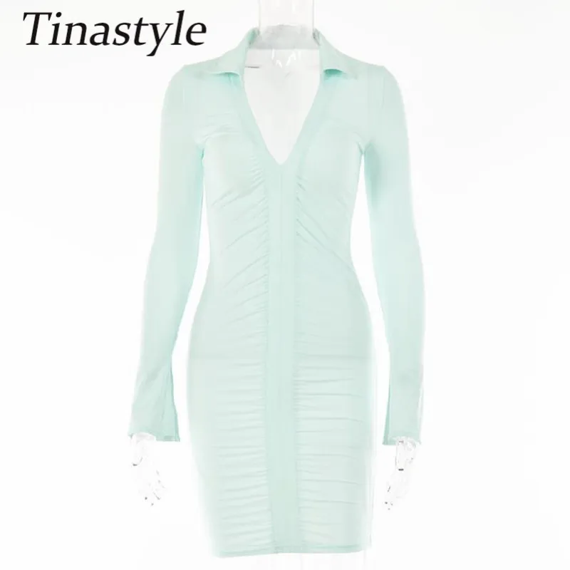 Женское короткое плиссированное платье Tinastyle, повседневное облегающее платье-мини с глубоким V-образным вырезом и длинным рукавом, лето 2021