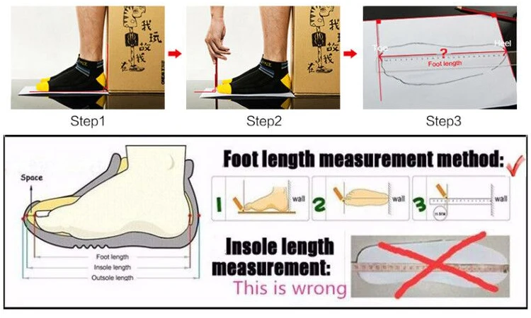 1. Измерьте длину вашей стопы, как показано на фотографиях, пожалуйста, не измеряйте длину стельки