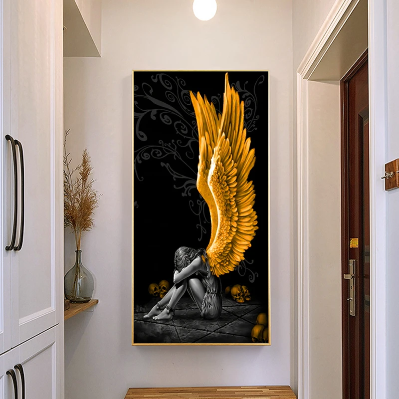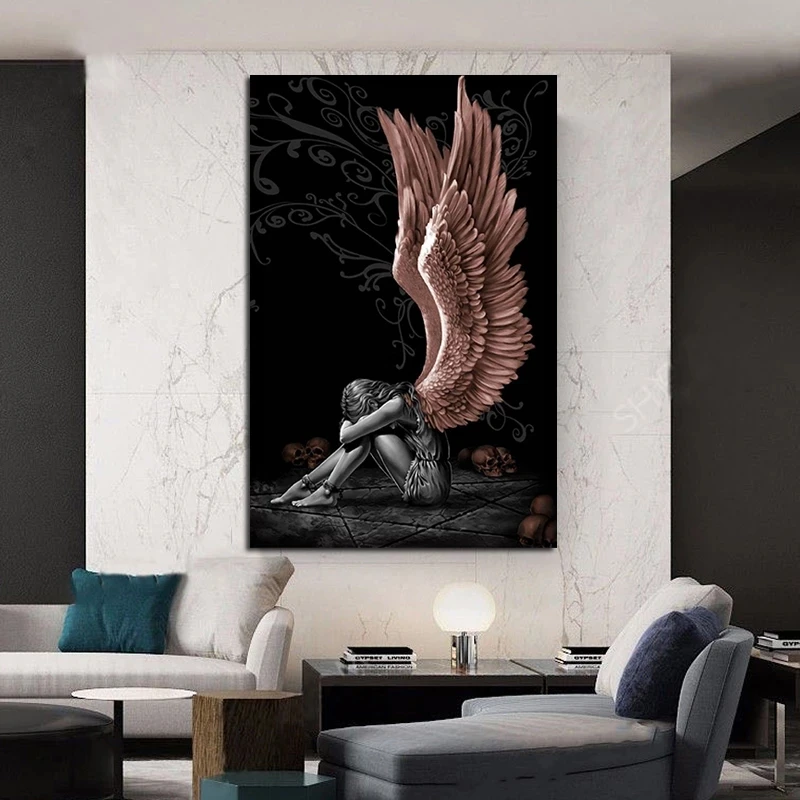 Картина с дьяволом и ангелом, серые персонажи, крылья, Череп, плака...
