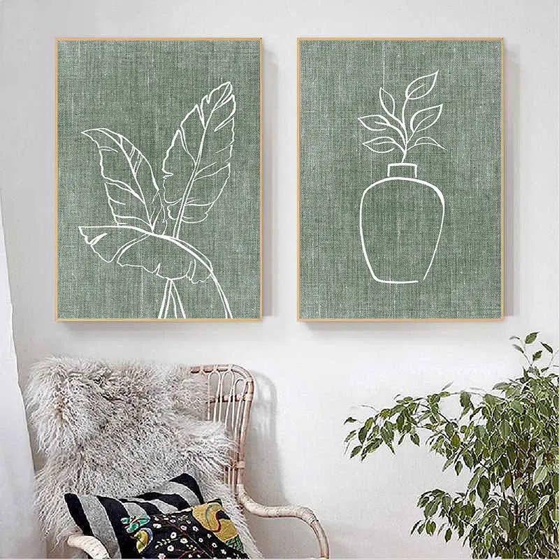 Настенная картина с зелеными растениями в скандинавском стиле, абстрактная форма, современные листья, простые картины на холсте в виде вазы, плакат для гостиной, домашний декор