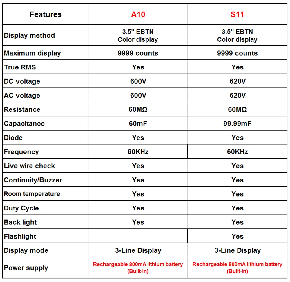 1 * мультиметр A10/S11. 1 * Тестовый свинец.1 * Руководство пользователя на английском языке. 1 * упаковочная коробка.1 * USB кабель для зарядки.1 * EVA портативный тканевый мешок.1 * защитный чехол (S11)