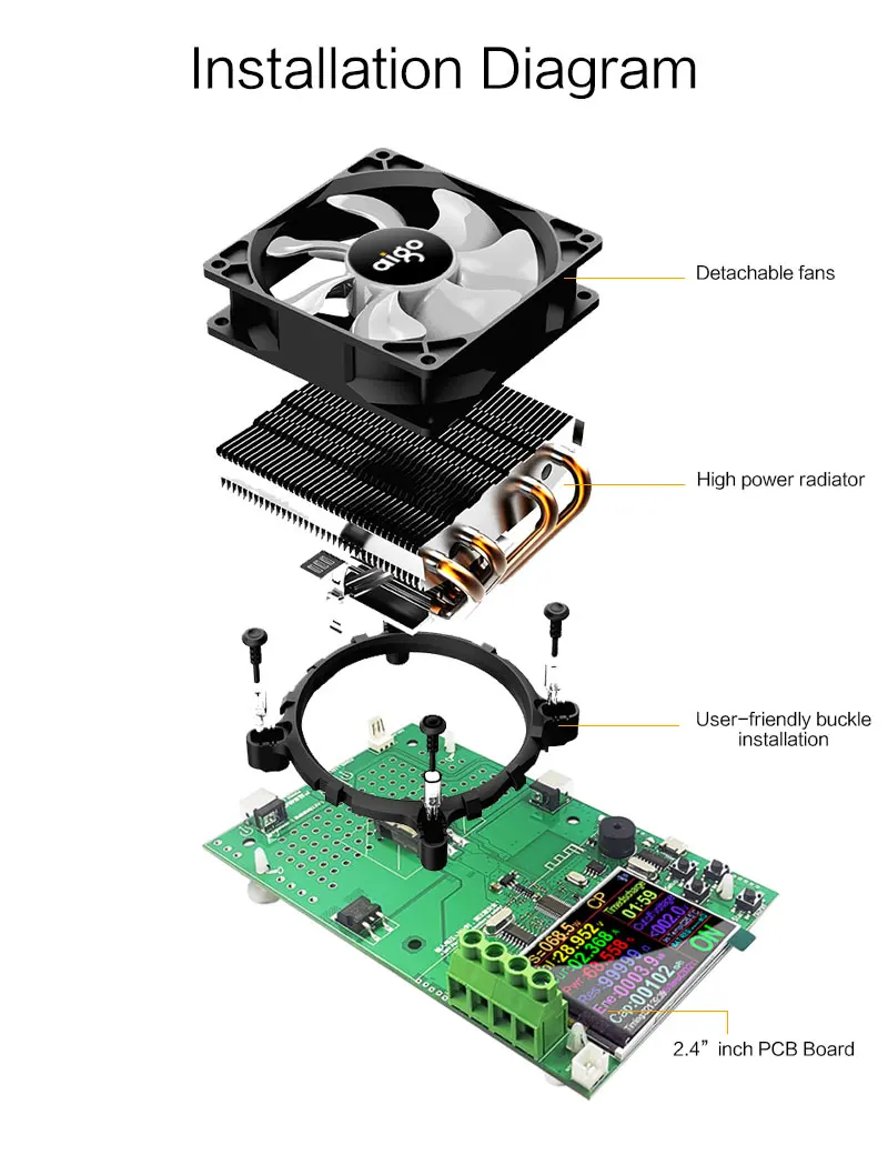 Товар хороший для самостоятельной сборки изготовленного корпуса. Вполне компактен и позволяет увеличивать мощность путем подключения аналогичных модулей без проблем. Есть много недостатков: кнопки управления мелкие и неудобные, их необходимо дублировать адекватными. Термопаста очень плохая, жидкая консистенция. Платка для подключения гнезд USB сделана из фольгированного текстолита, после нескольких установок в винтовой разъем - все развалиться. Провода с крокодилами - дубовые и очень короткие, их нужно заменить.