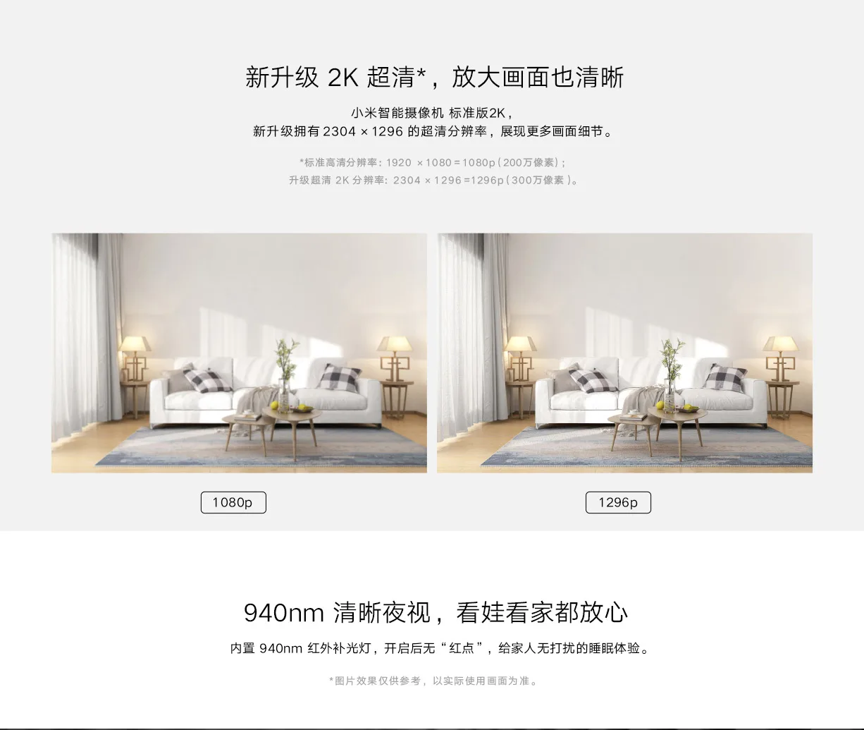 Умная камера iaomi Standard Edition 2K, Новое обновление имеет ультра-четкое разрешение 2304x1296, показывая больше деталей изображения. * Стандартное разрешение HD: 1920x1080 = 1080p (2 млн пикселей); Улучшенное СВЕРХЧЕТКОЕ разрешение 2K: 2304x1296 = 1296p (3 миллиона пикселей).