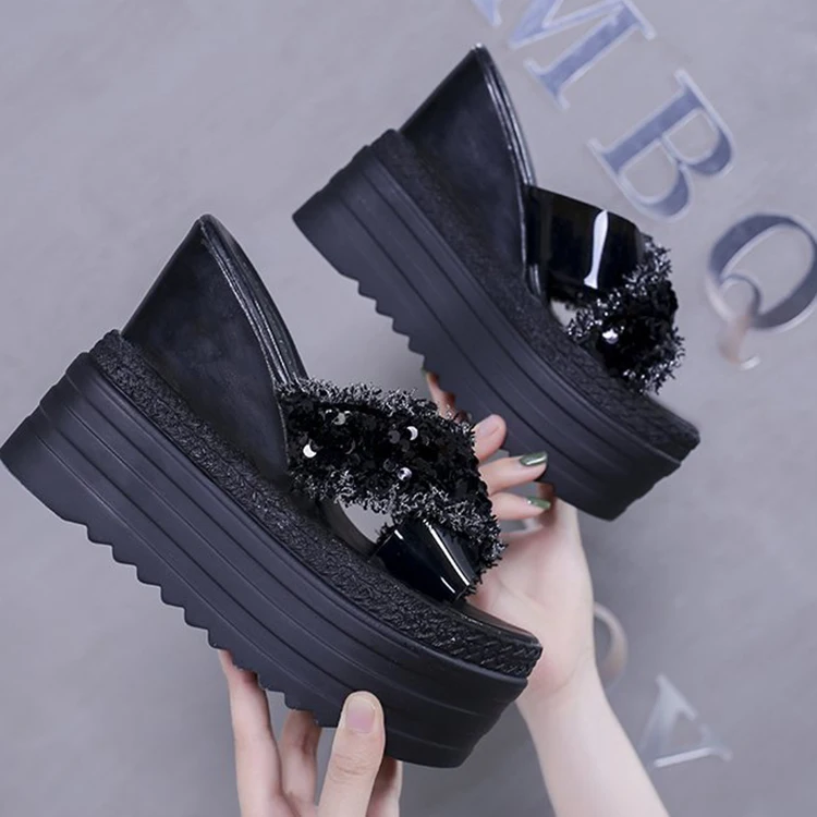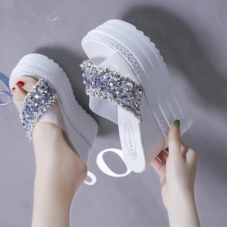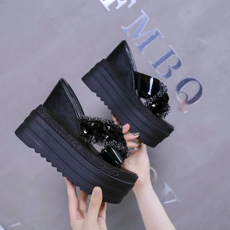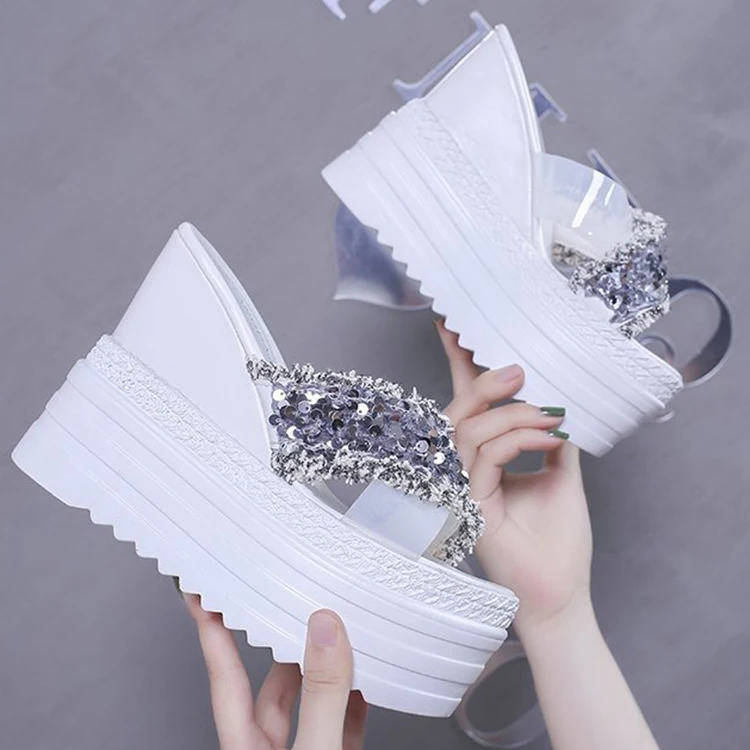 Туфли на танкетке на высоком каблуке; Летние шлепанцы; Женские 2021 Стразы Босоножки с открытым носком; Сандалии с ремешками на обувь, увеличивающая рост женская обувь на высокой платформе; Шлепанцы