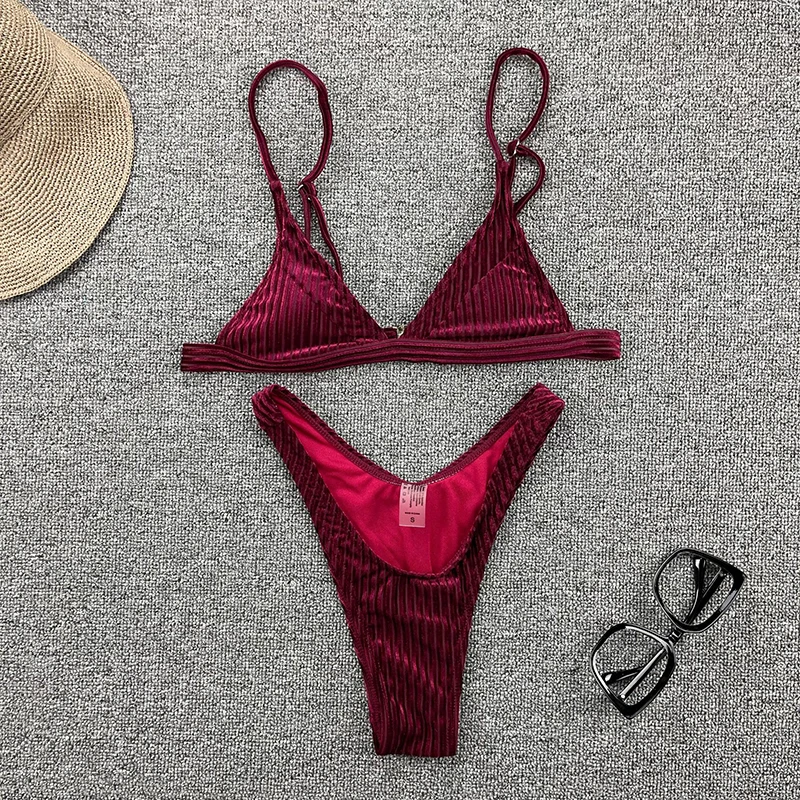Сексуальный бархатный купальник в рубчик 2021, Женские Треугольные микро стринги, бикини, летний купальный костюм с высоким вырезом, женское бикини