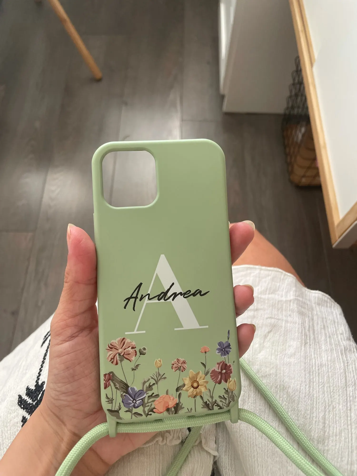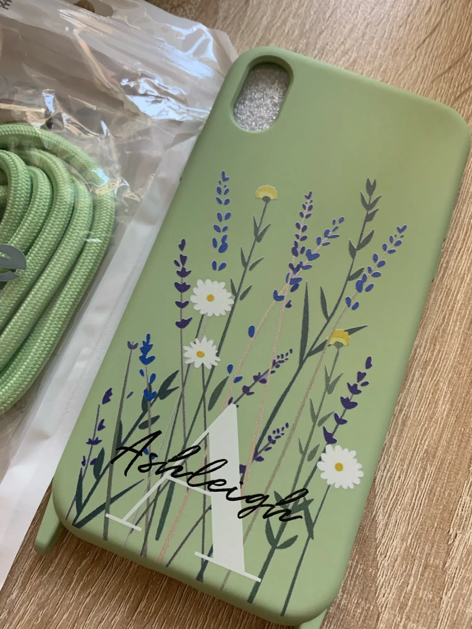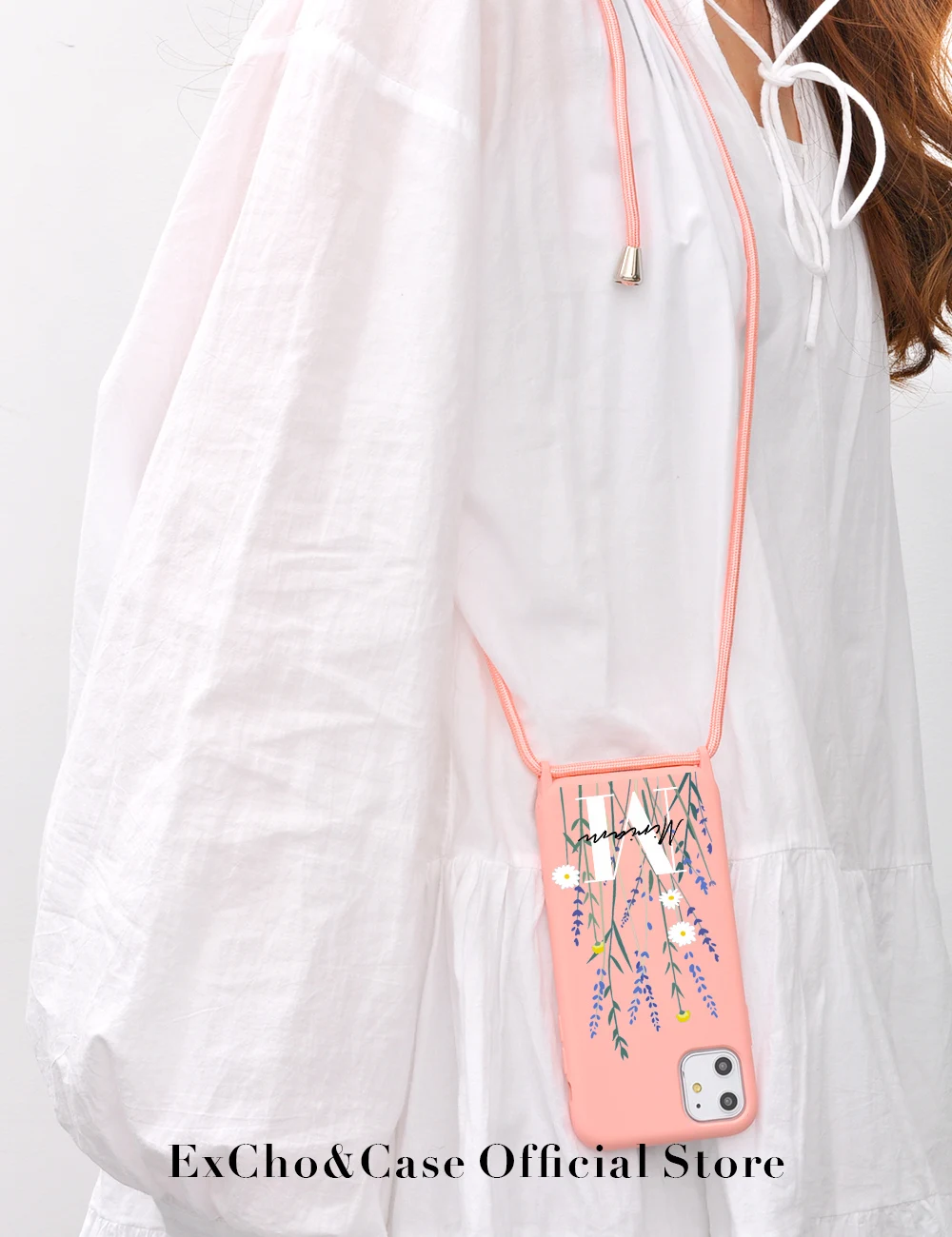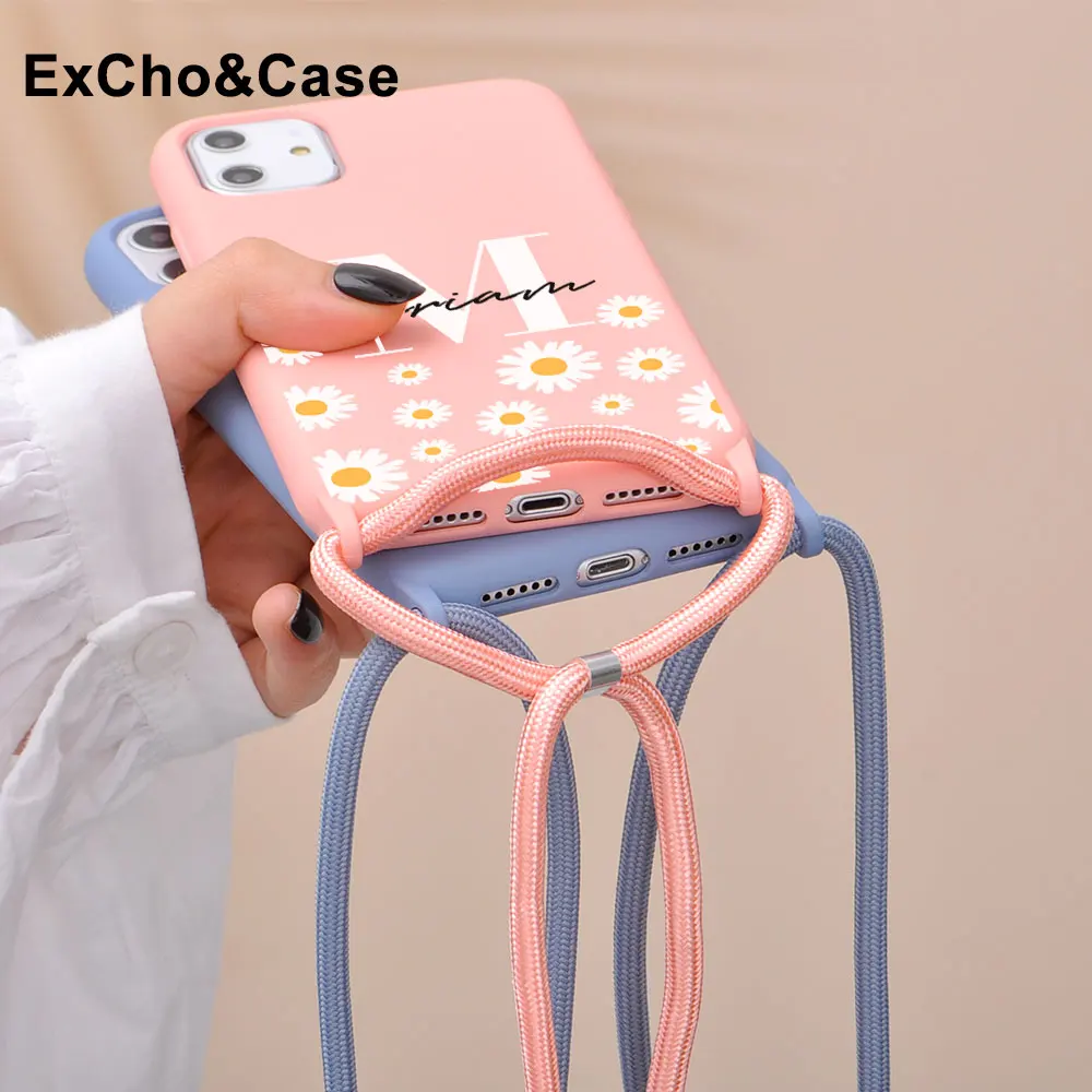Силиконовый чехол с индивидуальным именем для Apple iPhone 11 12 Pro Max X XR XS SE 7 8 Plus, ремешок через плечо, цветок, чехол для телефона с цветком для девочки с веревкой