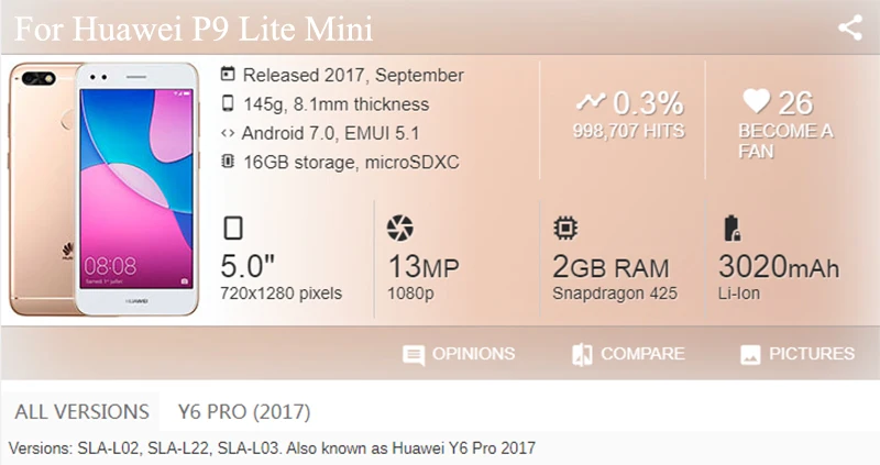 Номер моделиFor Huawei P9 Lite Mini SLA-L02, SLA-L22 SLA-L03 Y6 Pro 2017