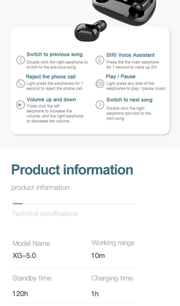 При покупке bluetooth-гарнитуры tws, пожалуйста, прочитайте следующие инструкции: из-за длительной транспортировки мощность наушников tws будет истощена. Вы не сможете использовать гарнитуру, когда получите посылка. Он может быть выключен. Первое, что нужно сделать, это зарядить гарнитуру в течение 30 минут. Очень важно. Спасибо!