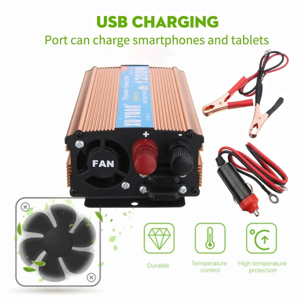 ●Инвертор мощности (1200 Вт)1. Преобразование источника электроэнергии постоянного тока 12 В в источник питания переменного тока 110 В.2. Переключатель ВКЛ./ВЫКЛ. Управления вентилятором3. Автоматическое тепловое отключение4. Дополнительная емкость всплеска напряжения5. Широко используется для всех видов электрического оборудования с потреблением энергии, которое напряжение равно 220 В переменного тока, таких как сотовый телефон, ноутбук, светильник, цифровая камера, Videocon, телевизор, CD-плеер, DVD, электрический вентилятор, электроинструменты и так далее.6. Безопасная конструкция зарядки защищает ваши устройства от избыточного тока, перегрева, короткого замыкания и перезарядкиВстроенный вентилятор охлаждения способствует снижению нагрева7. Корпус из алюминиевого сплава, антиоксидантный, прочный, модный и долговечный8. Непосредственно Подключите к автомобильному прикуривателю или аккумулятору, удобно использовать9. Идеально подходит для использования в автомобиле для отпуска, работы и кемпинга