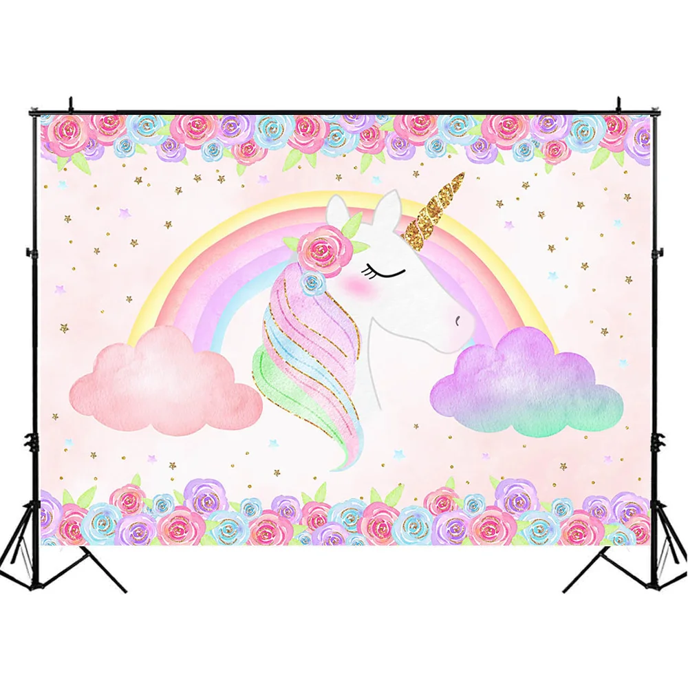 Радуга Единорог фон для фотосъемки с цветочным узором, с принтом маленькая звезда, розовые облака фон Baby Shower фон для фотосъемки фотосессия Фотостудия