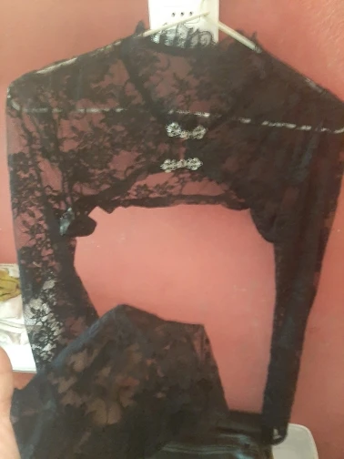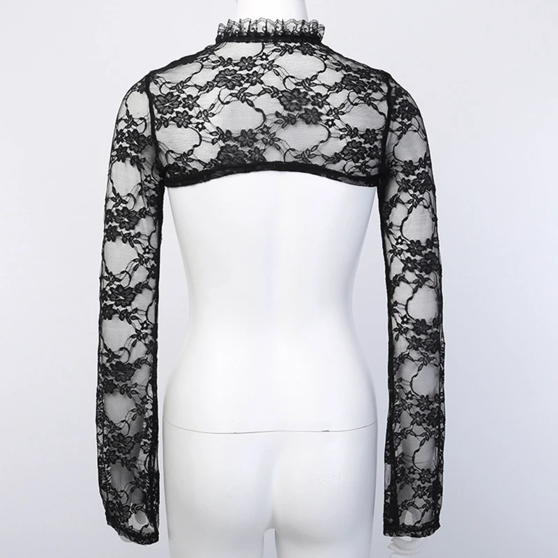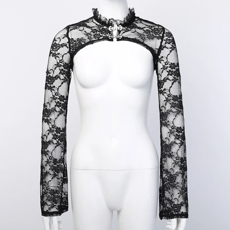 Особенности:Воротник-стойка с рюшами, длинные рукава, сексуальное открытое Прозрачное цветочное кружево, однотонный черный цвет, две пряжки спереди.Короткая обрезанная длина, особенно показывает идеальное покрытие на руках, делая Шикарный Прекрасный вырез выделиться.Идеальный выбор, чтобы улучшить наряд: большой размер, чтобы прикрыть плечи, один размер подходит всем. Выглядит более женственно и нежно.Идеальное дополнение к платью без бретелек. Сочетаются с вашим вечерним платьем, укороченным облегающим топом, топом на бретелях, лифом.Подходит для свадебной вечеринки, коктейля, бальных платьев, фотосессий, выступлений, дня рождения, вечера и так далее.Только 1 кроп-топ, другие аксессуары на фото не включены!