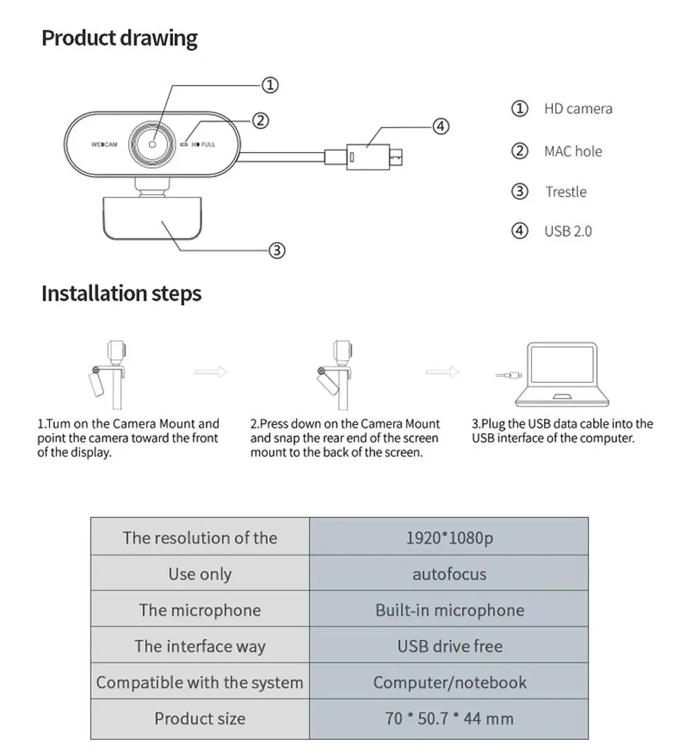 Объектив: HD-объективТип сенсора: CMOSФормат видео: AVIЧастота кадров: 30 кадров в секундуТип накопителя: свободный накопитель. Подключи и работайДлина USB-кабеля: 120 смФормат фотографии: BMP JPGРазрешение: 1920*1080 PФормат вывода: M-JPEGТип интерфейса: USB2.0Контроль мигания: 50 ГцМикрофон: Встроенный микрофонДиапазон фокусировки: 20 ммРазмер изделия: 70 мм * 50,7 мм * 44 ммВспомогательное оборудование: Поддержка основных компьютеров, таких как Windows 2000, XP, Vista, Win7, Win8, Win10, Mac OS, Linux и других операционных системВес нетто 62,8 г
