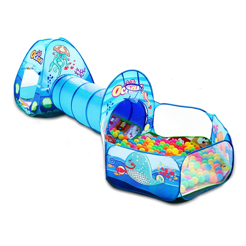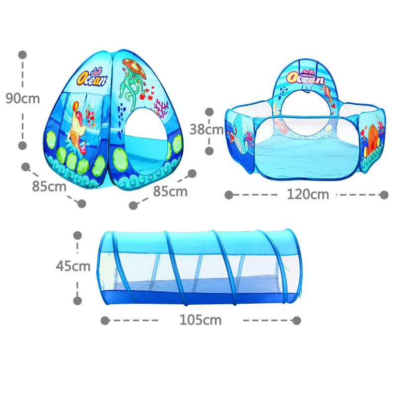 Особенности: 1. Три в одном палатке, различные способы игры. Может использоваться в качестве бассейна с мячом, замка, ползающего туннеля, стрельбы и т. д. 2. Большое пространство, портативный, легко складывается, с сумкой для хранения. 3. Несколько детей могут играть вместе. 4. Яркие узоры привлекают внимание детей. Плавайте в семье под морем, Веселитесь и познакомитесь.