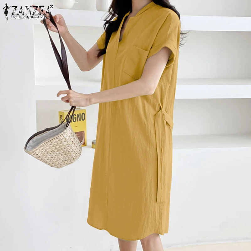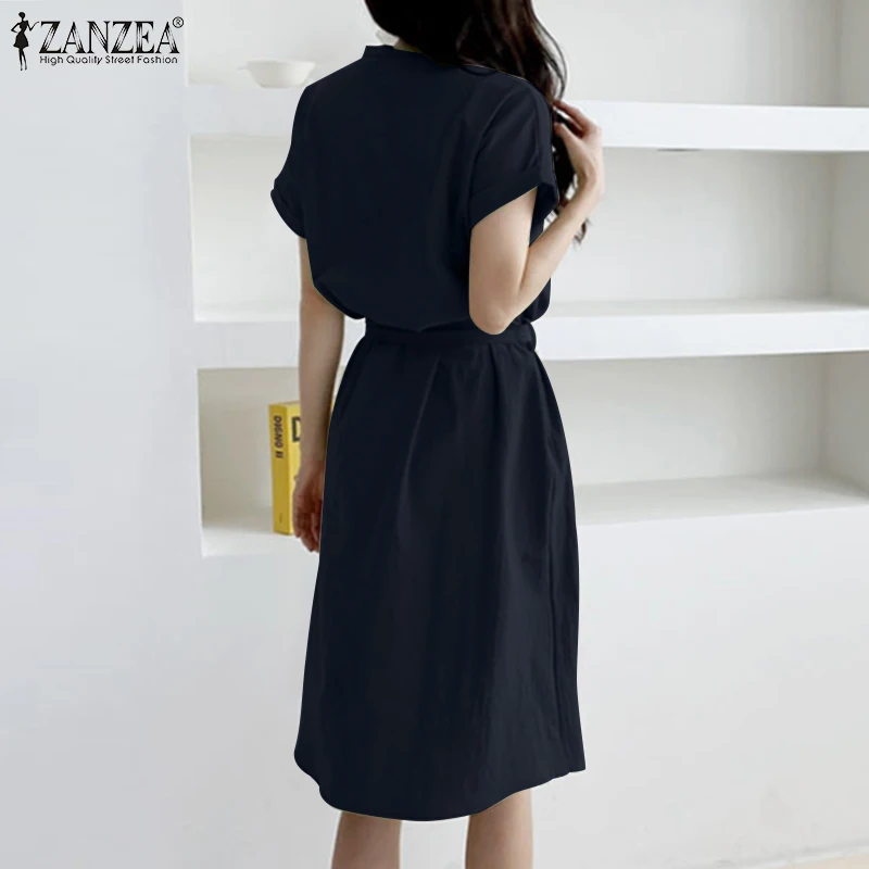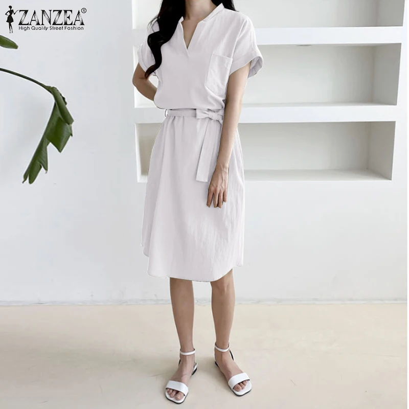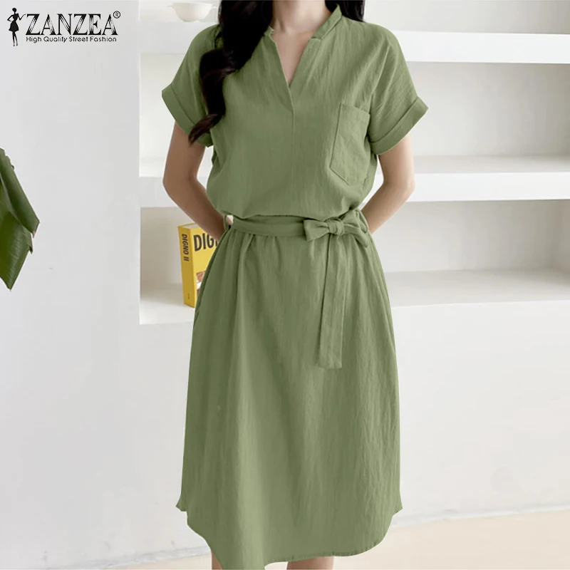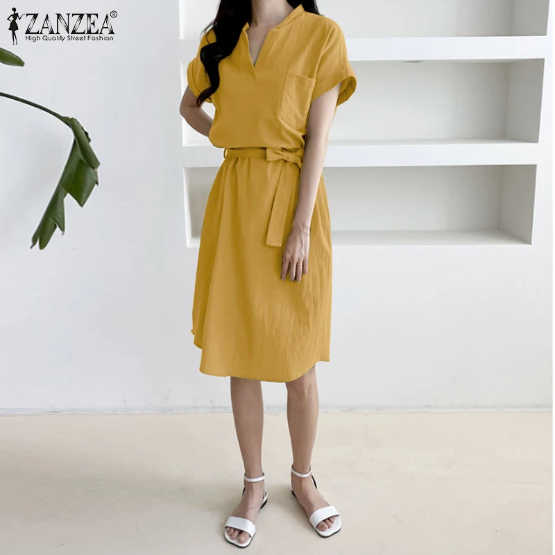 Женский летний сарафан ZANZEA 2021 элегантное однотонное платье-рубашка длиной до колен с коротким рукавом женское платье с поясом