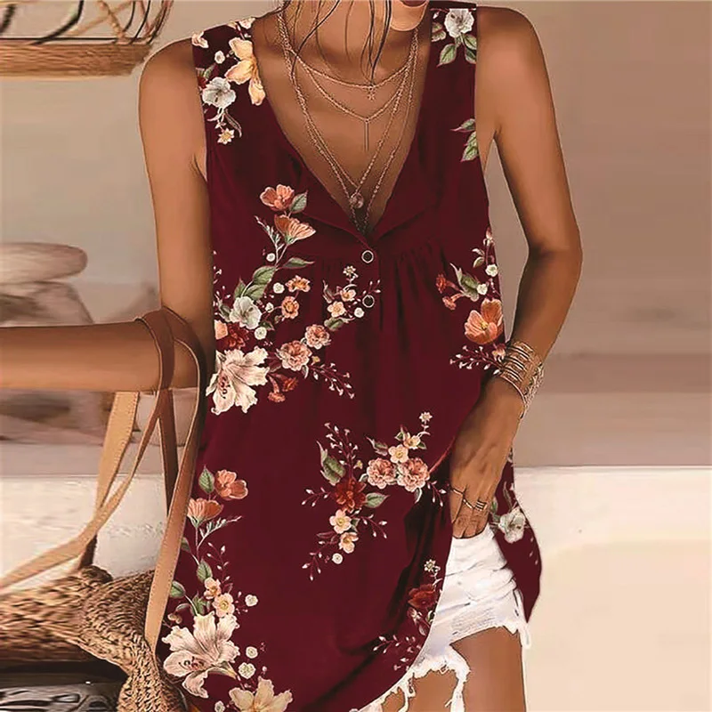 Женская блузка без рукавов, с глубоким V-образным вырезом и цветочным принтом