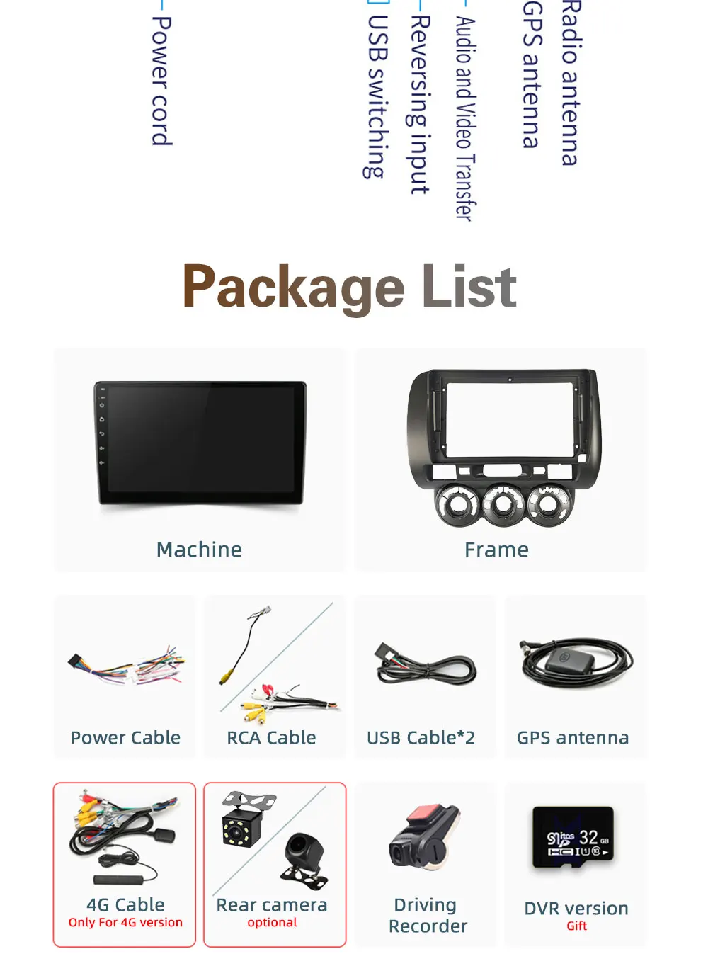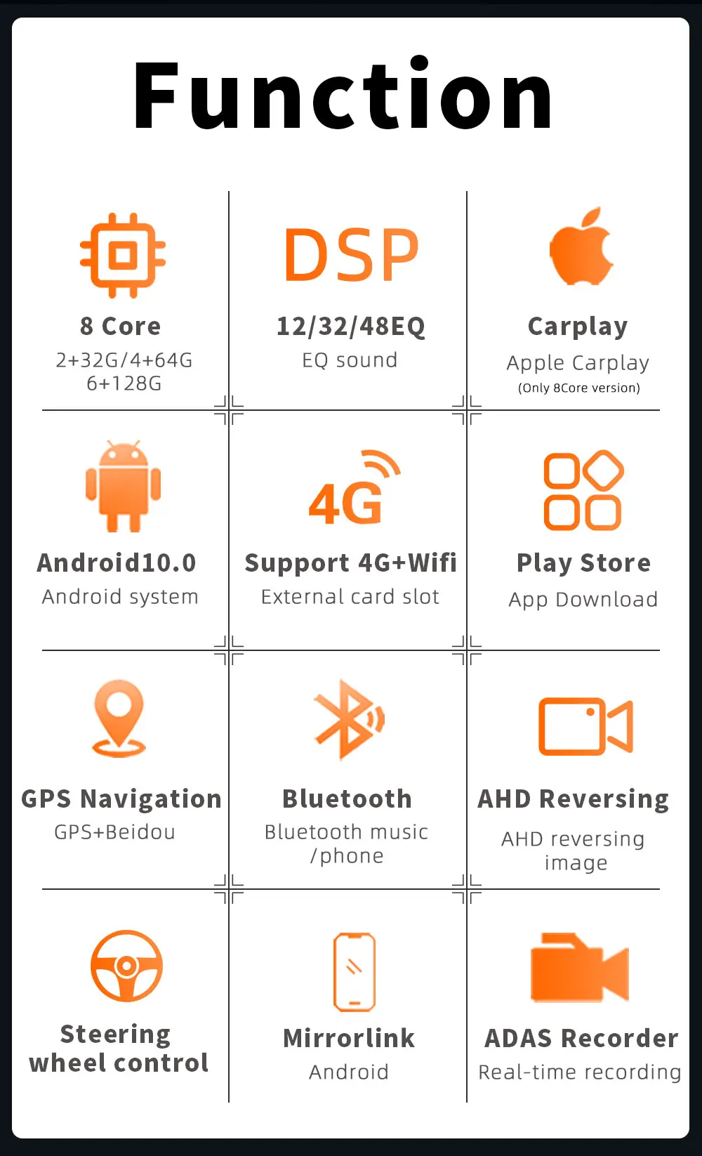 1. Подключение к Wi-Fi: встроенный модуль Wi-Fi, вы можете просматривать Интернет через точку доступа Wi-Fi, загружать приложение для просмотра ТВ, фильмов и т. Д. Онлайн2. Gps-навигация: Встроенный навигационный модуль, Бесплатная навигационная карта (включая большинство стран/регионов), Поддержка многоязычного интерфейса/голосовой навигации3. Функция Bluetooth: Встроенный модуль Bluetooth, поддержка bluetooth-подключения телефона, громкой связи или воспроизведения музыки по Bluetooth4. Функция зеркальной связи: поддержка подключения к телефону Android через usb-кабель и точку доступа Wi-Fi, фотографии телефонов, музыка, видео и т. д. будет отображаться на android-проигрывателе5. Функция Carplay: подключение к машине через мобильный телефон Wi-Fi точка доступа6. Встроенный игровой магазин: вы можете скачать нужные приложения7. Функция входного сигнала DVR: поддержка входного сигнала внешнего регистратора USB (DVR) (только для DVR с приложением), который может управляться через APPDVR.6.8. Функция заднего хода: Поддержка входа камеры заднего хода, Реверсивный более безопасный и удобный9. Настройка радио: Поддержка настройки FM, вы можете слушать радио, которое вас интересует, и наслаждаться временем вождения.10. Вход заднего usb-порта: Поддержка заднего usb-кабеля, который может воспроизводить музыку/фильмы (не включая u-диск)11. Разрешение 1280*720: обеспечивает высокое качество изображения12. Улучшите качество звука эквалайзера, используйте эквалайзер для регулировки звука, чтобы представить лучшие результаты13. Встроенная GPS автономная карта, поддержка онлайн-карты, Совместимость с картой Google14. Поддержка изменения логотипа автомобиля15. Поддержка многофункционального управления рулем16. Язык OSD: индонезийский/Малайский/Чешский/Датский/немецкий/английский/испанский/Филиппинский/французский/Хорватский/итальянский/Латышский/Литовский/Венгерский/голландский/Норвежский Мальтийский/Польский/Португальский/румынский/Словацкий/Финский/Шведский/Вьетнамский/Турецкий/Греческий/Болгарский/русский/украинский/Иврит/урду/арабский/персидский/хинди/Бенгальский/тайский/кхмерский/Корейский/китайский/традиционный китайский/японский