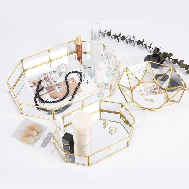 Латунный лоток для хранения, Золотая многоугольная стеклянная тарелка для закусок, тарелка для макияжа и ювелирных изделий кухонное украшение для дома