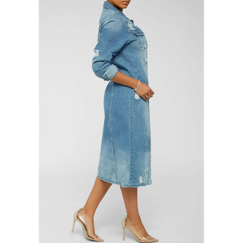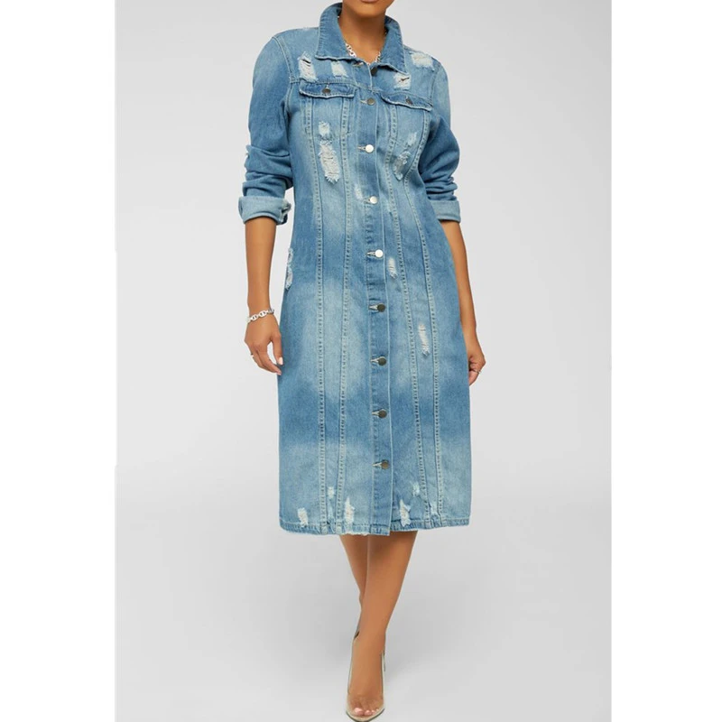Женская длинная джинсовая куртка, рваная верхняя одежда с отложным ...