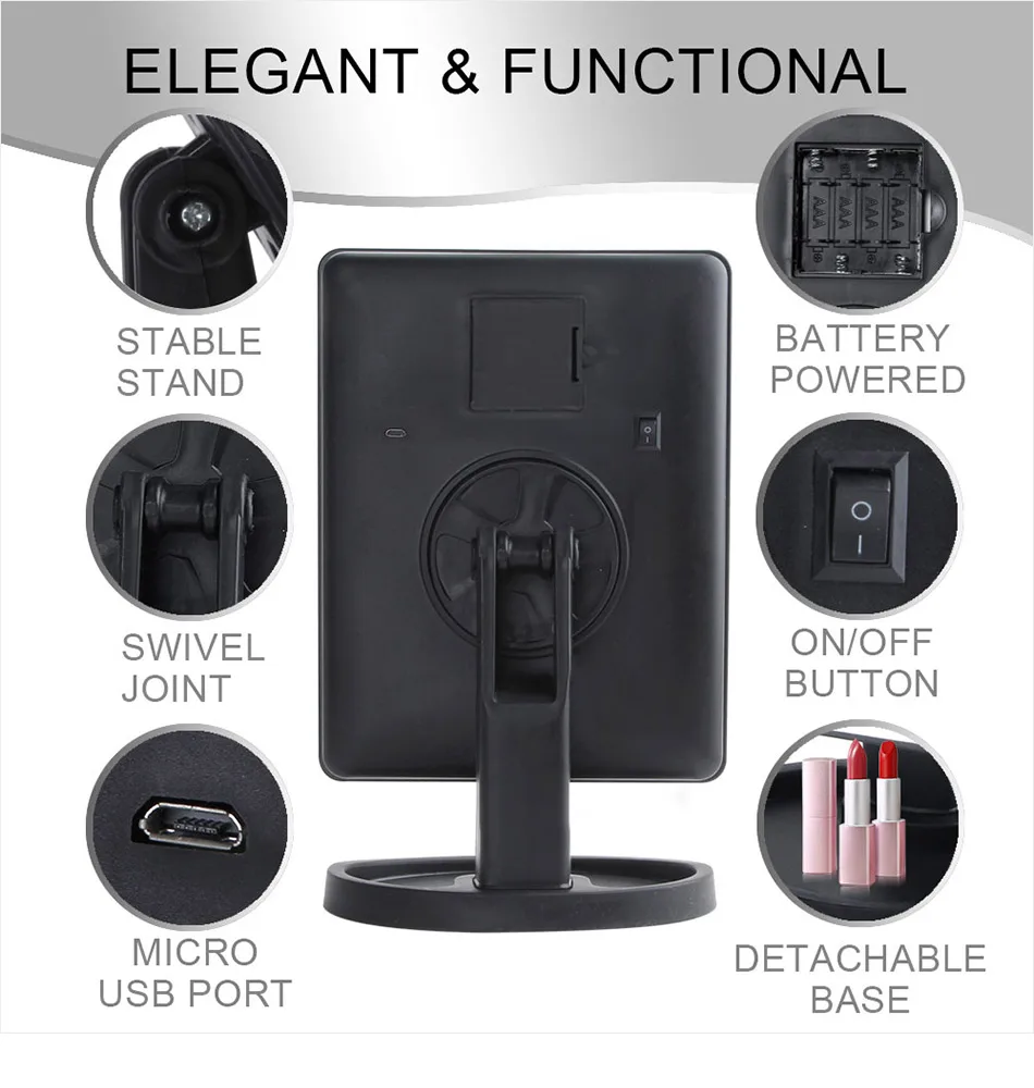 Особенности:Может стоять в плоском положенииИспользуйте аккумулятор или usb-кабельИспользуемый материал не легко повредитьИнтеллектуальный переключатель с сенсорным экраномОткрытый может быть остановлен под разными углами для использованияПолный диапазон освещения без мертвого угла22 светодиодный индикатор, можно регулировать яркость. В темном месте может четко отражать ваш внешний видЛегкий в эксплуатации мощный выключатель, возможность адаптироваться под другой светильник, различный светильник окружающей среды. Можно найти светильникИнтенсивность, что вам нужно в сенсорный экран Интеллектуальный переключательУстановка батарей:Снимите крышку аккумулятора на задней части зеркалаВставьте 4 батарейки АА в направлении, указанном внутри батарейного отсекаОбязательно вставьте аккумулятор правильно (+/ -)Замените крышку аккумулятораИнструкции по использованию:Чтобы включить, переместите переключатель на заднюю часть зеркалаПлотно нажмите на круг на передней части зеркала, свет будет освещенПресс и удерживайте круг для того, чтобы уменьшить светильник интенсивностиНажмите на круг снова, чтобы выключить светКогда не используется, переместите переключатель на заднюю часть зеркала, чтобы выключитьЭто позволит сохранить энергопотребление в режиме ожидания