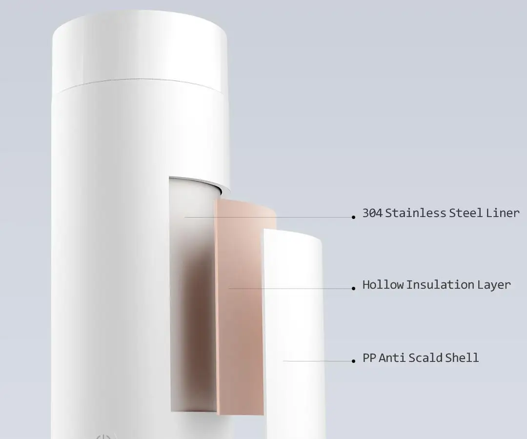 Внутренняя часть чашки состоит из двухслойной нержавеющей стали 304, бескамерного процесса, при комнатной температуре она может сохранять тепло в течение 6 часов *.