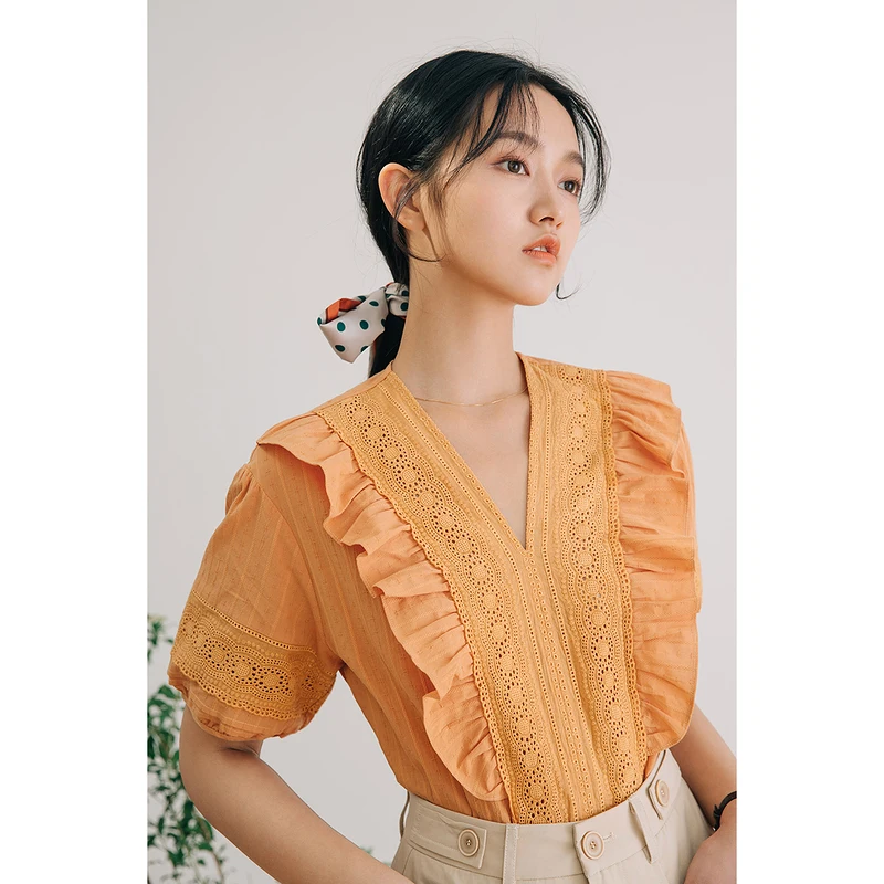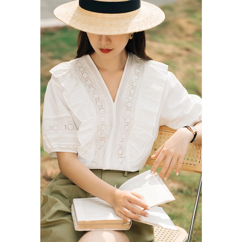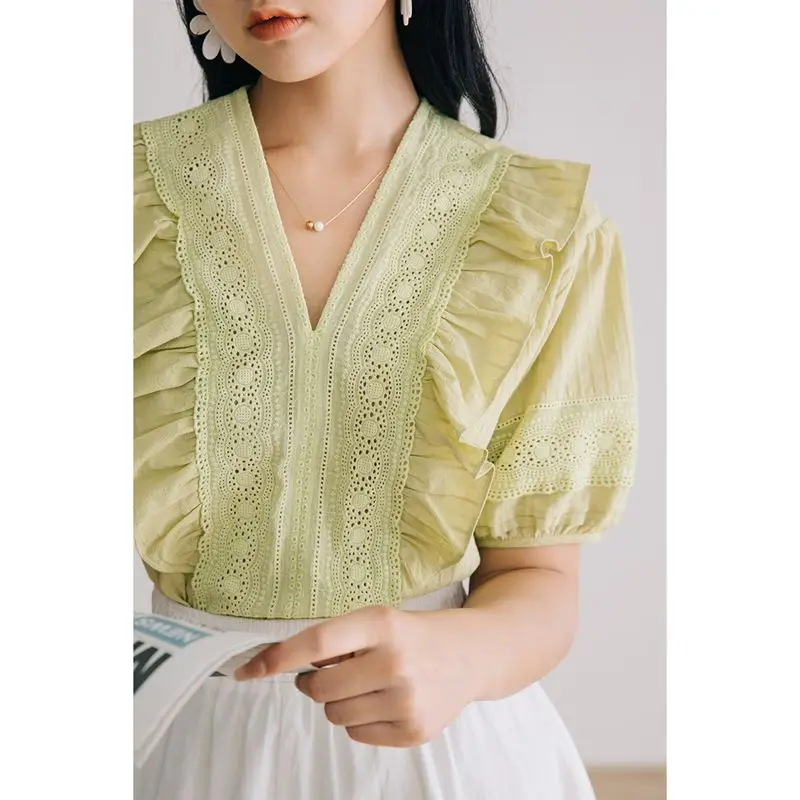 Женская жаккардовая блузка в пасторальном стиле с V-образным вырезом и оборками