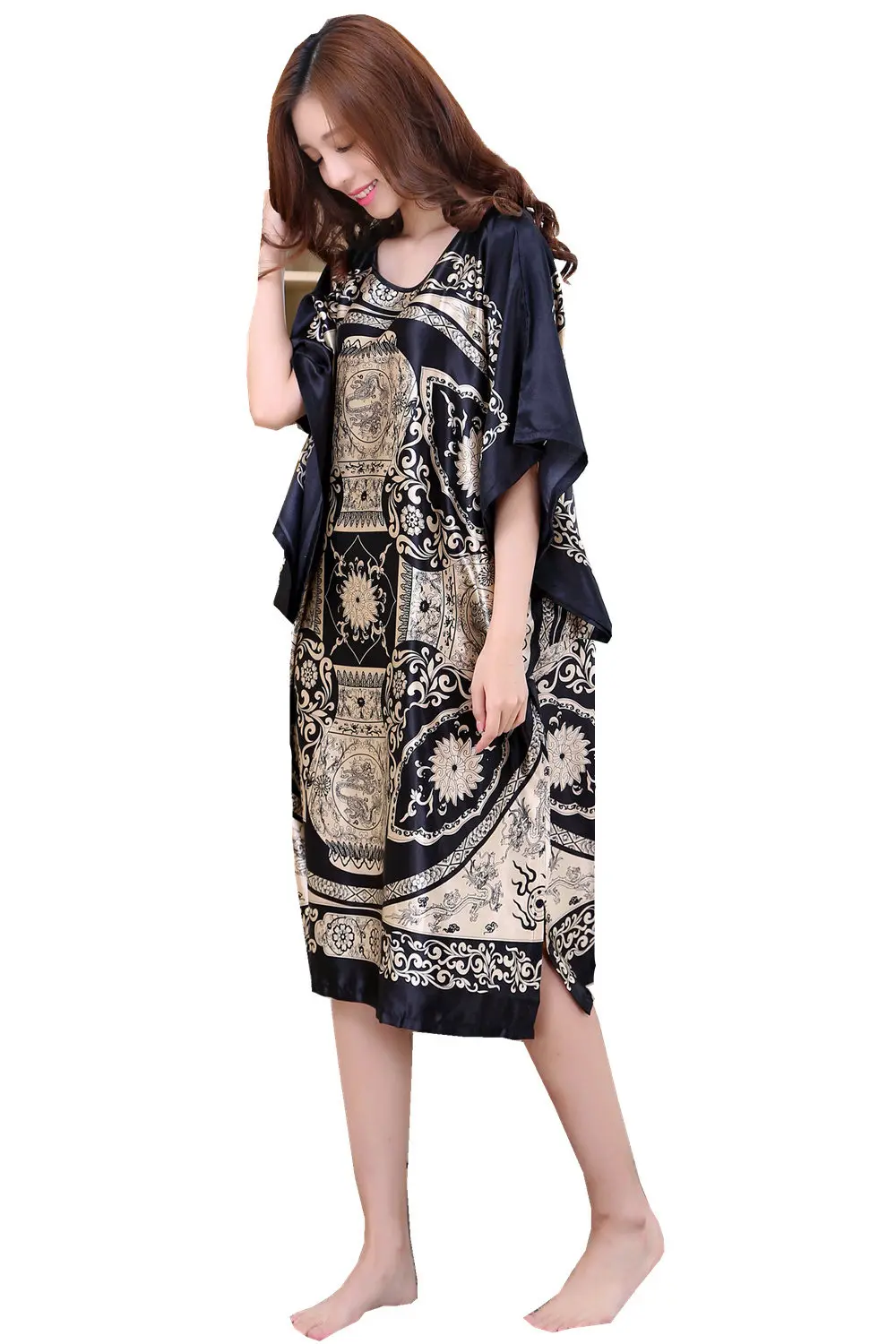 Женский халат LS007B, черный летний халат из искусственного шелка, ...