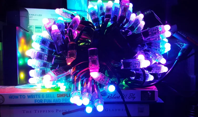 Так легко подключить гирлянду с режимом bluetooth, светодиодные головки обернуты резиновой и полностью герметичной водонепроницаемостью, выглядит как высокое качество, Я могу легко затемнить и изменить цвет с помощью контроллера, так замечательно.