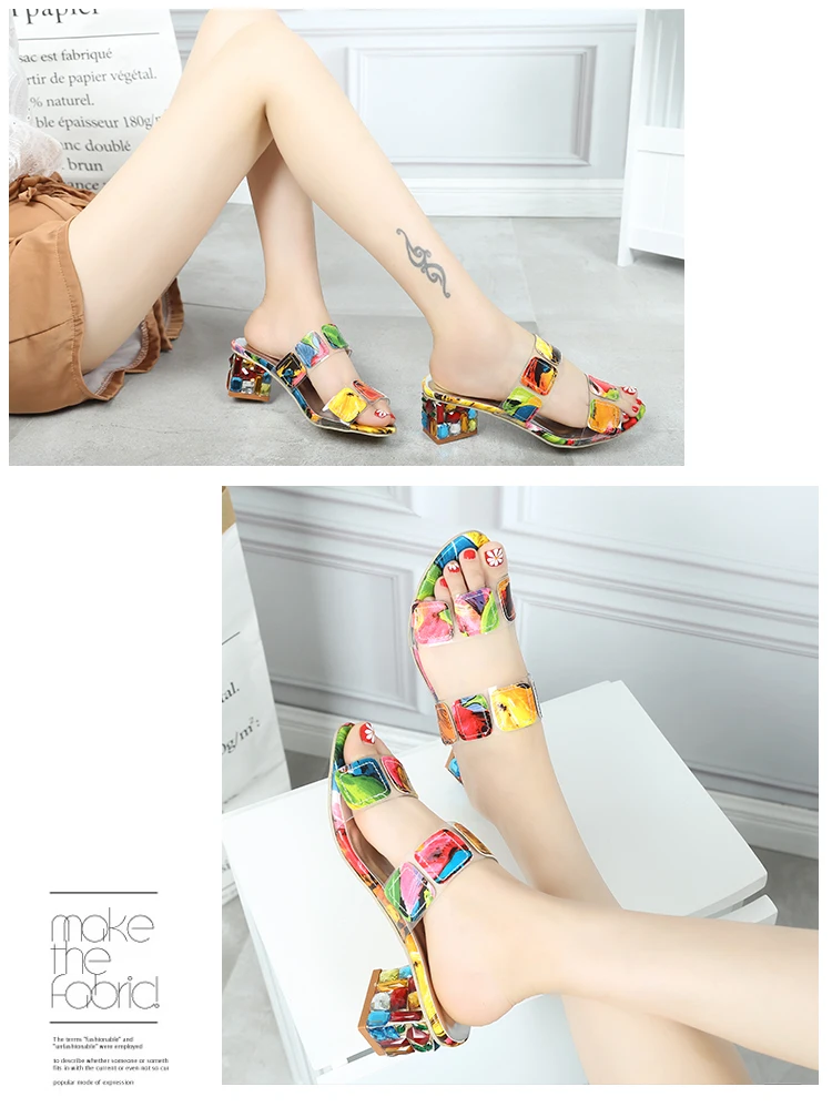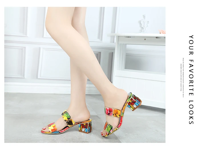 Женские тапочки с открытым носком, цветные стразы, простой дизайн, удобные милые тапочки на Высоком толстом каблуке