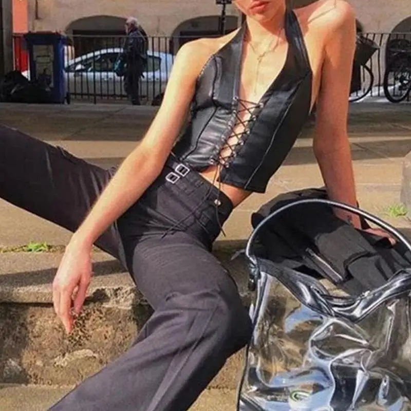В готическом стиле и стиле панк укороченный Топ для женщин с ремешками крест накрест корсет без рукавов Мягкая тонкая кофточка Клубная одежда уличная полые кожаные жилет Se J4X1