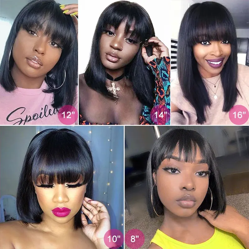 Натуральный черный прямой короткий парик Боб с челкой, бразильские волосы, парики без клея, полностью машинная работа, парики без сетки для женщин