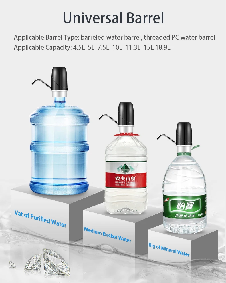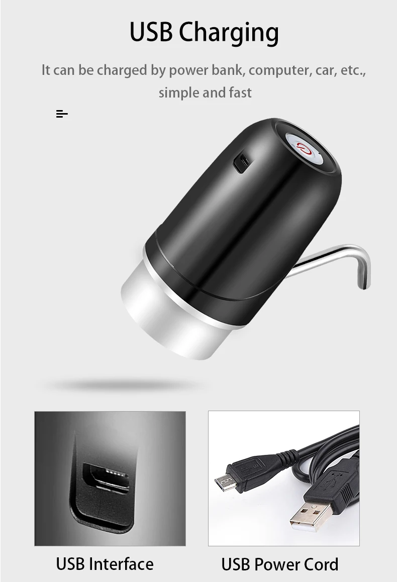 1. Предназначен для ухода за пожилыми и детьми, прост в установке, пить воду одним щелчком мыши 2. Разработан с безопасным материалом, не токсичен и не пахнет, 304 нержавеющая сталь вода, здоровье и охрана окружающей среды 3. Подходит для чистой питьевой бутилированной воды, различные модели галлона баррель с 2,16 дюймов (5,5 см) Шея 4. Встроенный аккумулятор USB 1200 мАч, используется для 30-40 дней или около 4-6 бутылок воды 5 галлонов после полной зарядки