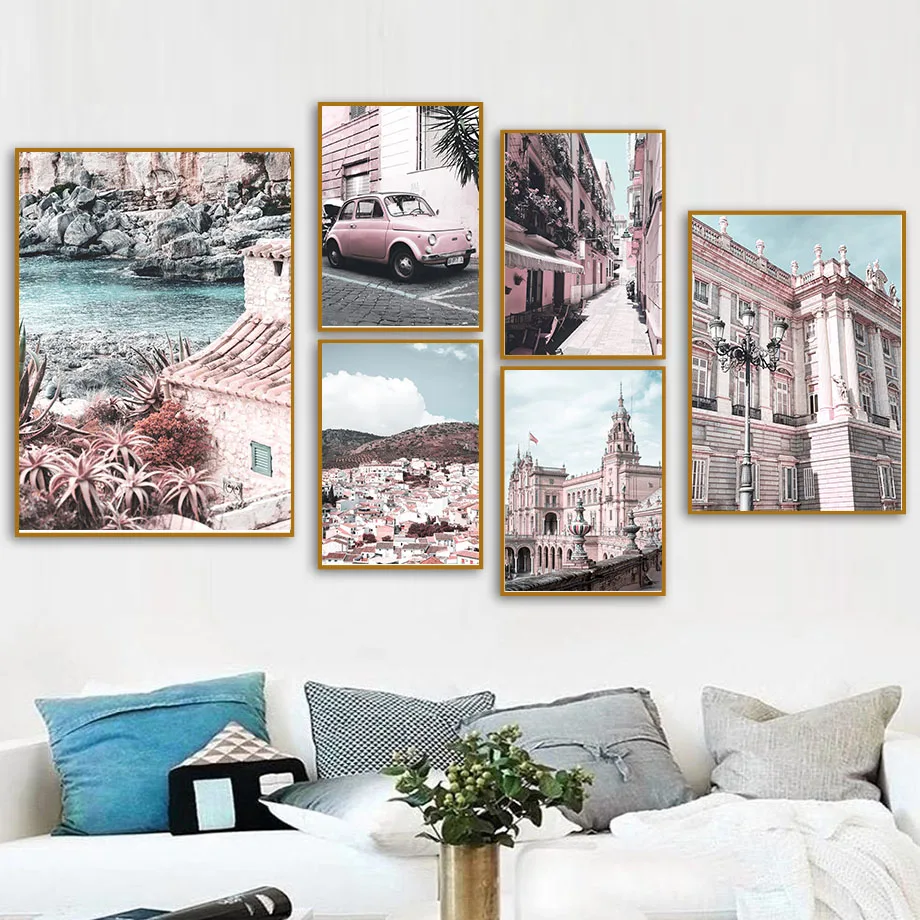 Розовые пляжные морские волны цветок сок пончик настенная живопись ...