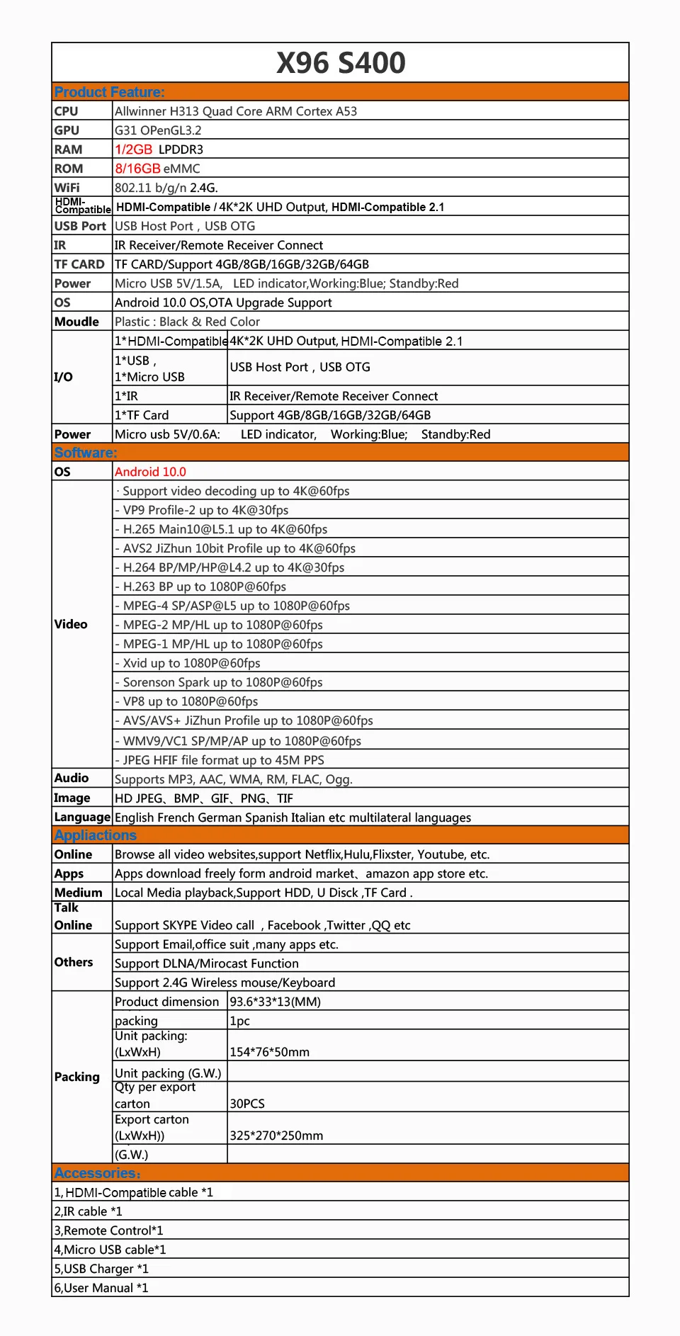 ТВ-приставка X96, S400, ip TV Box, Android 10,0, 1 ГБ, 8 ГБ, 2 ГБ, 16 ГБ