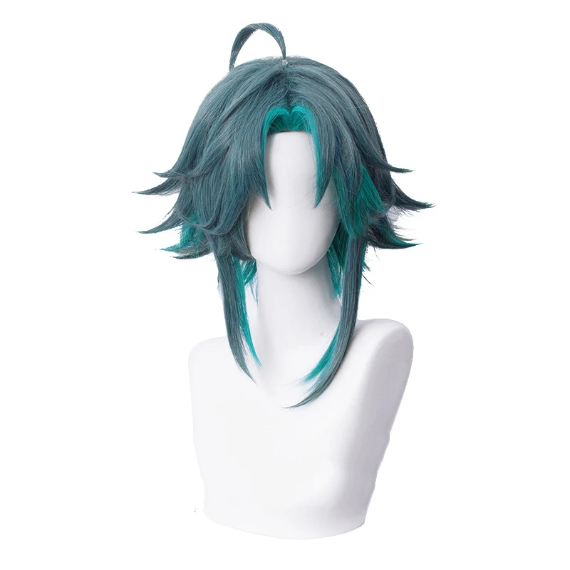 Парик для косплея Xiao из аниме Genshin Impact, термостойкий искусственный волос, смешанный, темно-зеленый, синий, с короткими волосами, для взрослых, для ролевых игр на Хэллоуин с шапочкой