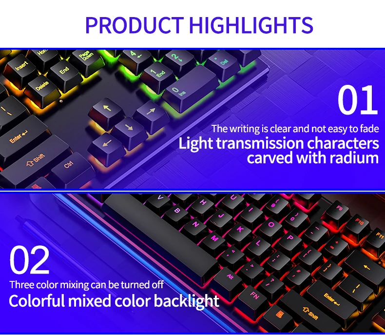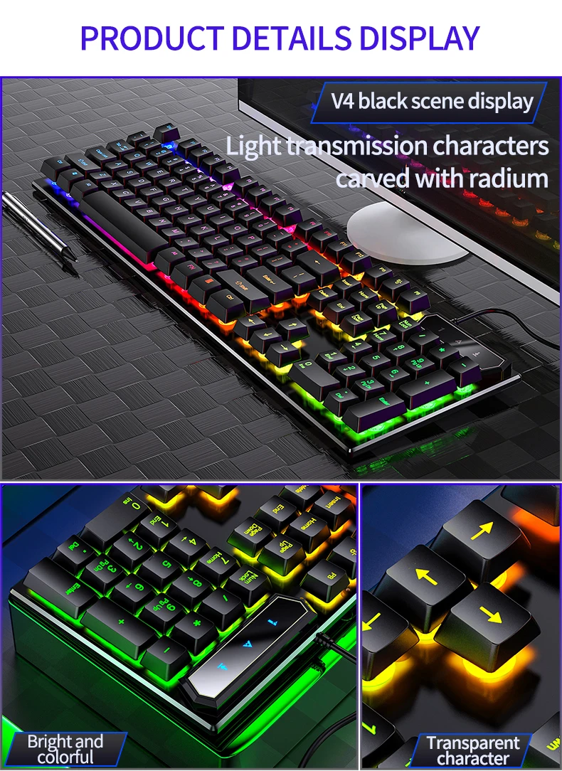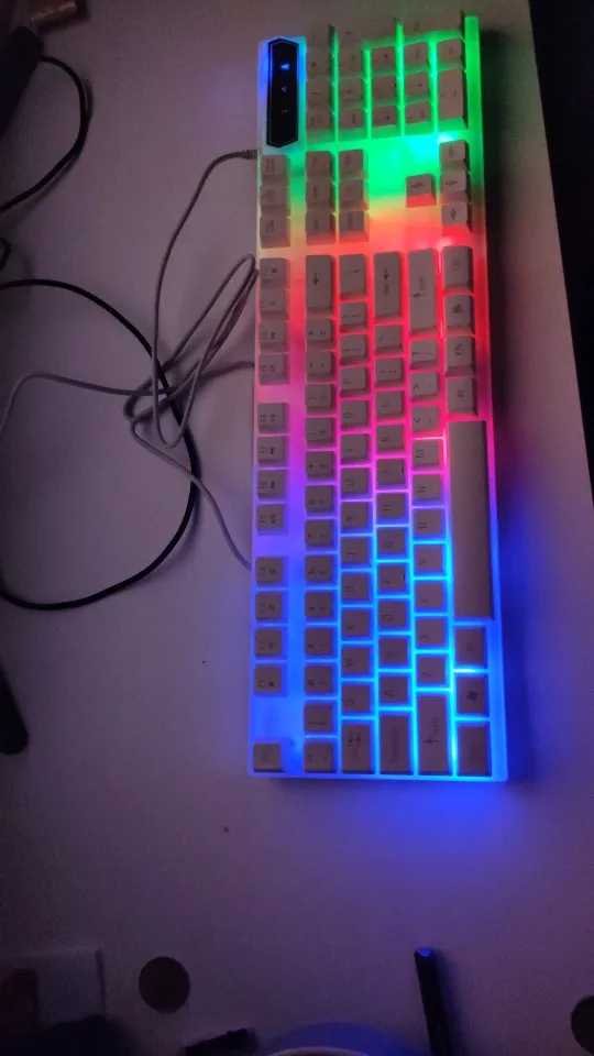 Особенность:1. Колпачки для ключей в Стиле Подвески, водонепроницаемые и пыленепроницаемые, легко снимать и тщательно чистить для более длительного времени работы.2. Модный стиль и изогнутый дизайн клавиш обеспечивают очень крутое механическое ощущение.3. Корпус изготовлен из утолщенного АБС-материала, прочный и износостойкий.4. Эффекты подсветки цвета радуги: приносят классный игровой опыт, в частности, увеличивают игровые клавиши с подсветкой и легко набирают в темноте.5,16 крепежных винтов полностью закрыты, что делает их более прочными, чем обычные клавиатуры! Оснащен 4 дренажными отверстиями, регулируемой двойной опорой для ног + двойными нескользящими наклейками для ног.Спецификация:Цвет: черный/белыйРазмер клавиатуры: около 442x134x22 ммСрок службы кнопки: 5 миллионов нажатийПосылка1 проводная клавиатура