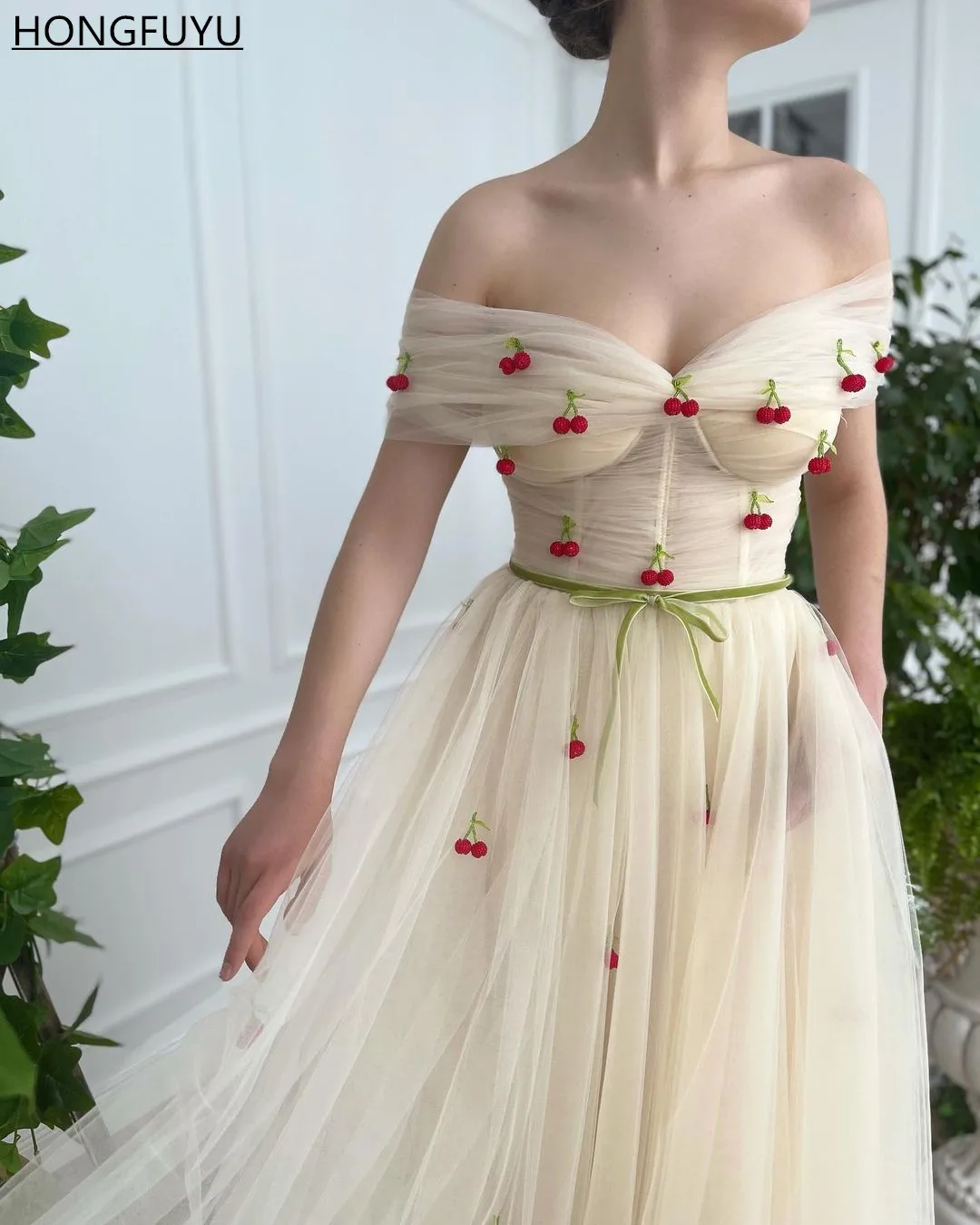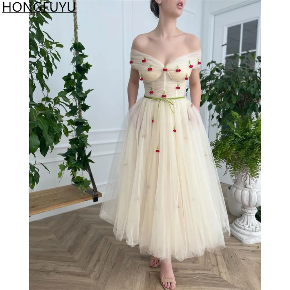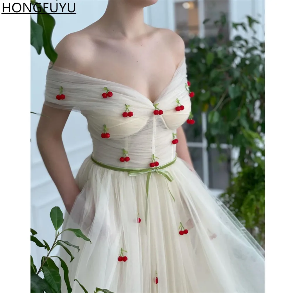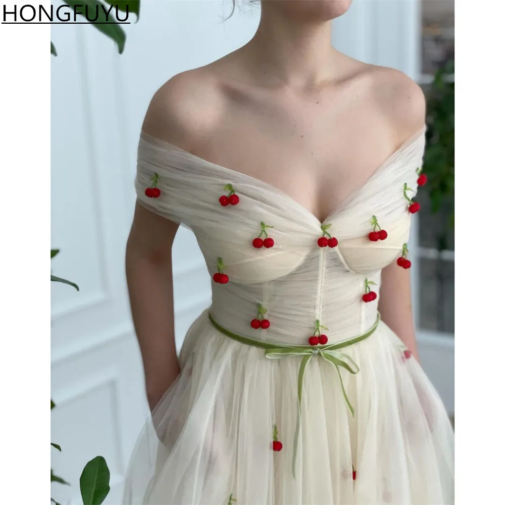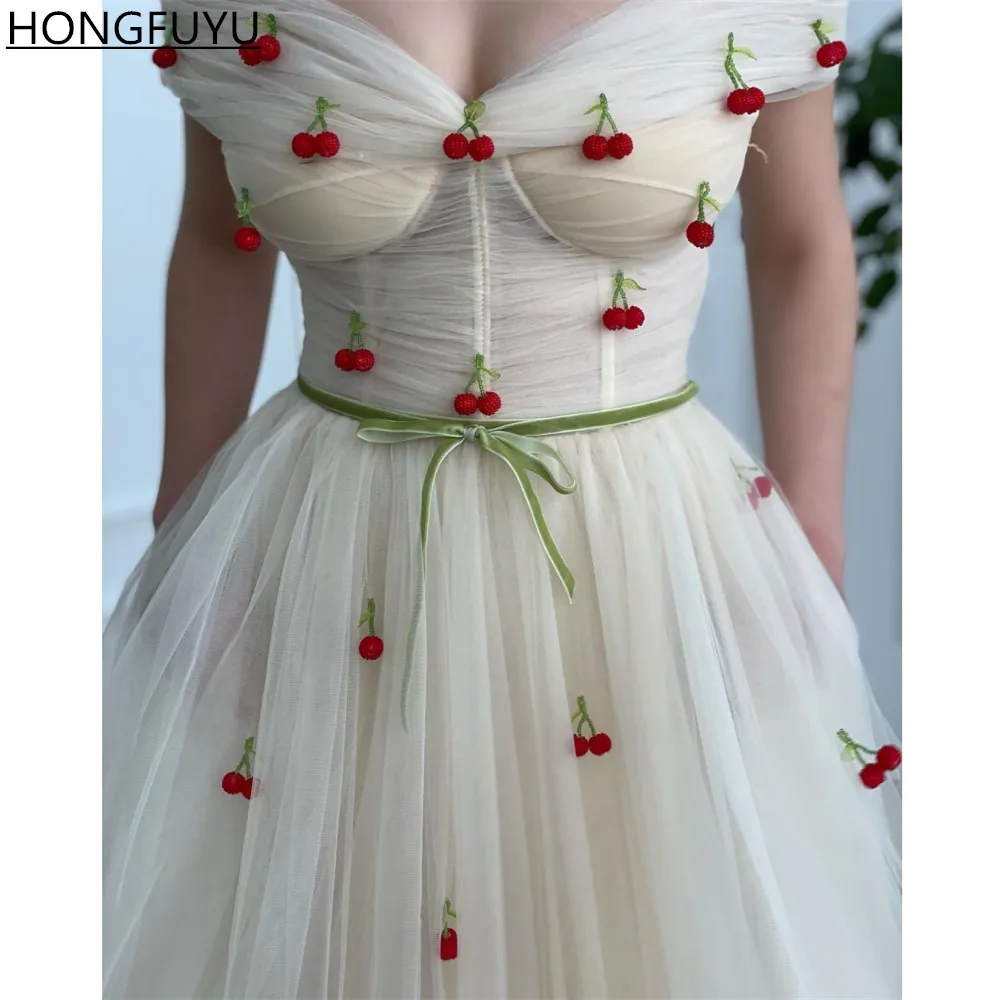 HONGFUYU милые тюлевые платья средней длины с вишневым рисунком Выпускные платья с открытыми плечами длиной до середины икры коктейльные платья с карманами для свадебной вечеринки на заказ