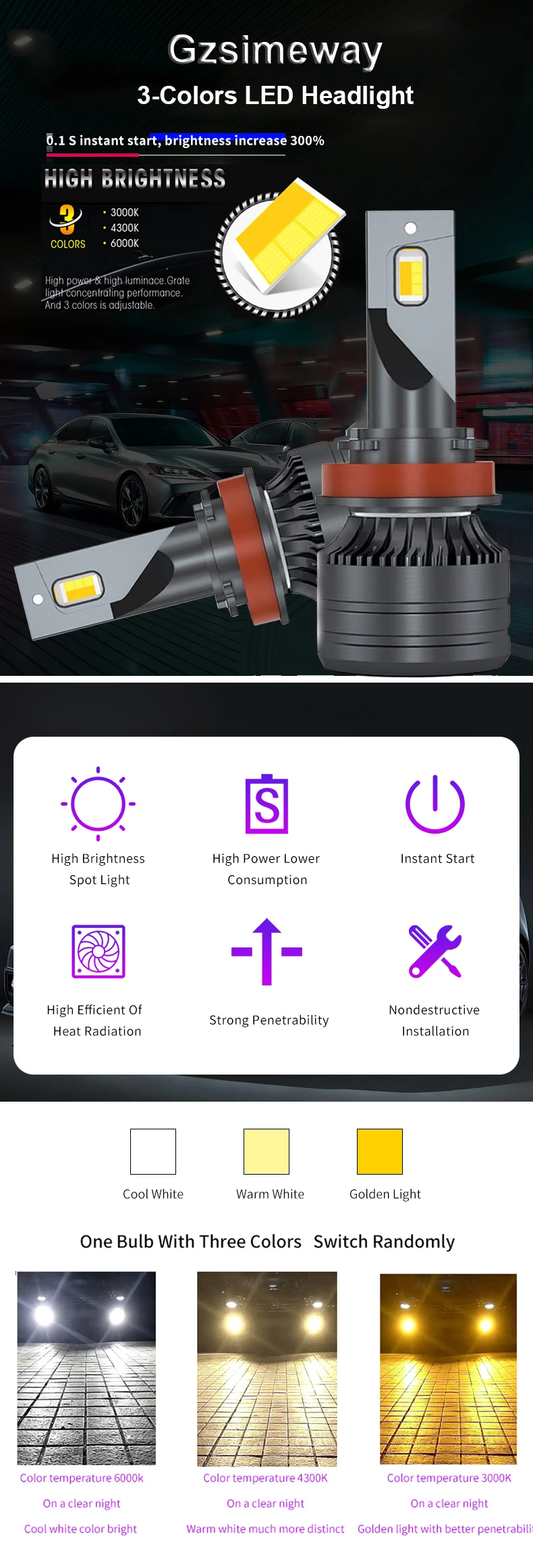 3. Три цвета трехцветной лампы-Цветовая температура 3000K, цветовая температура 4300K и цветовая температура 6000K