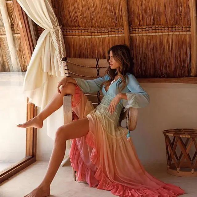 Женское длинное платье с рюшами, V-образным вырезом и воланом