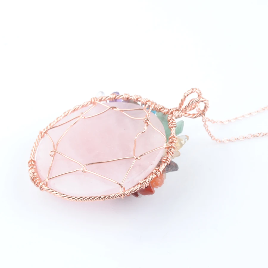 Quartzs камень Кабошон Древо жизни кулон из розового золота Цвет провода Обёрточная бумага чипов и аппликацией в виде дерева колье с целебным кулоном цепи 45 см IN4245