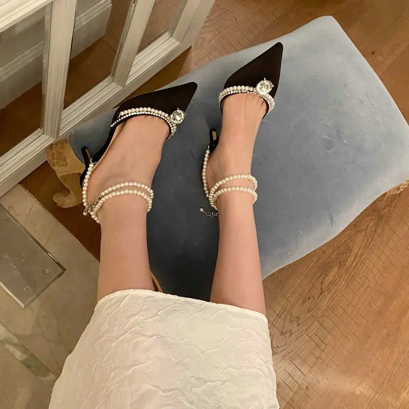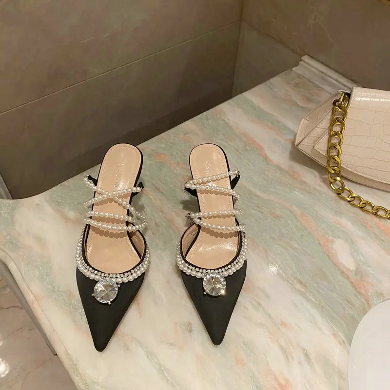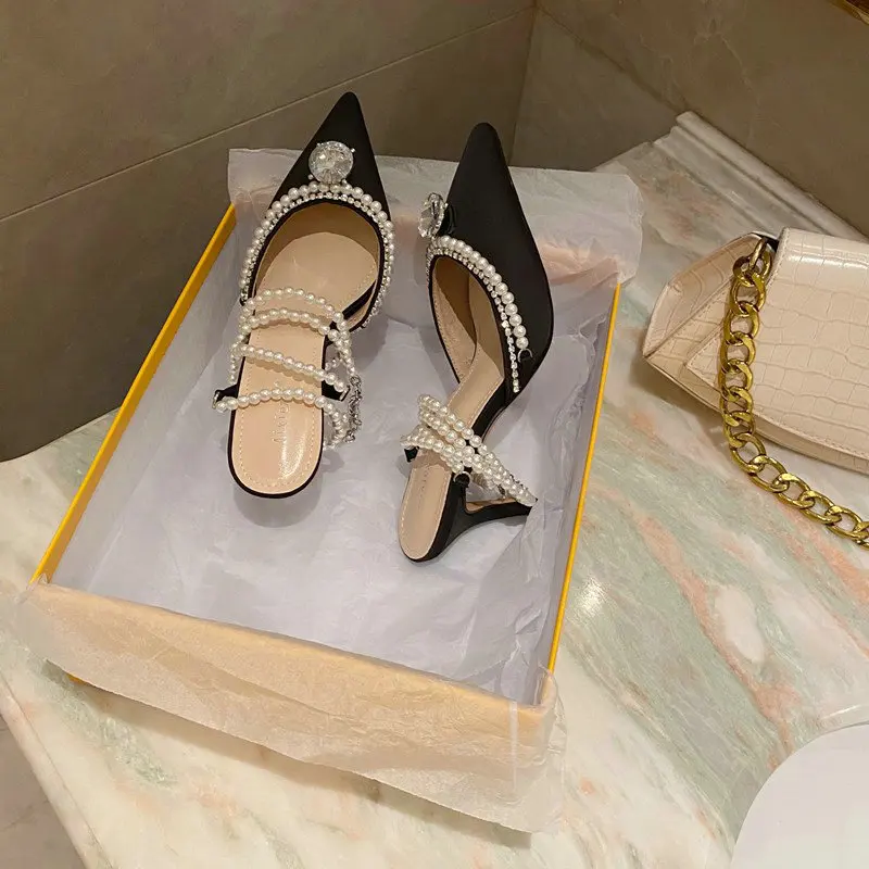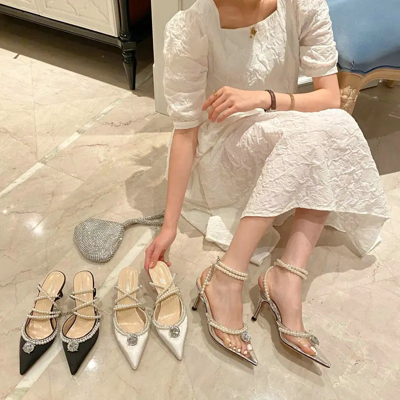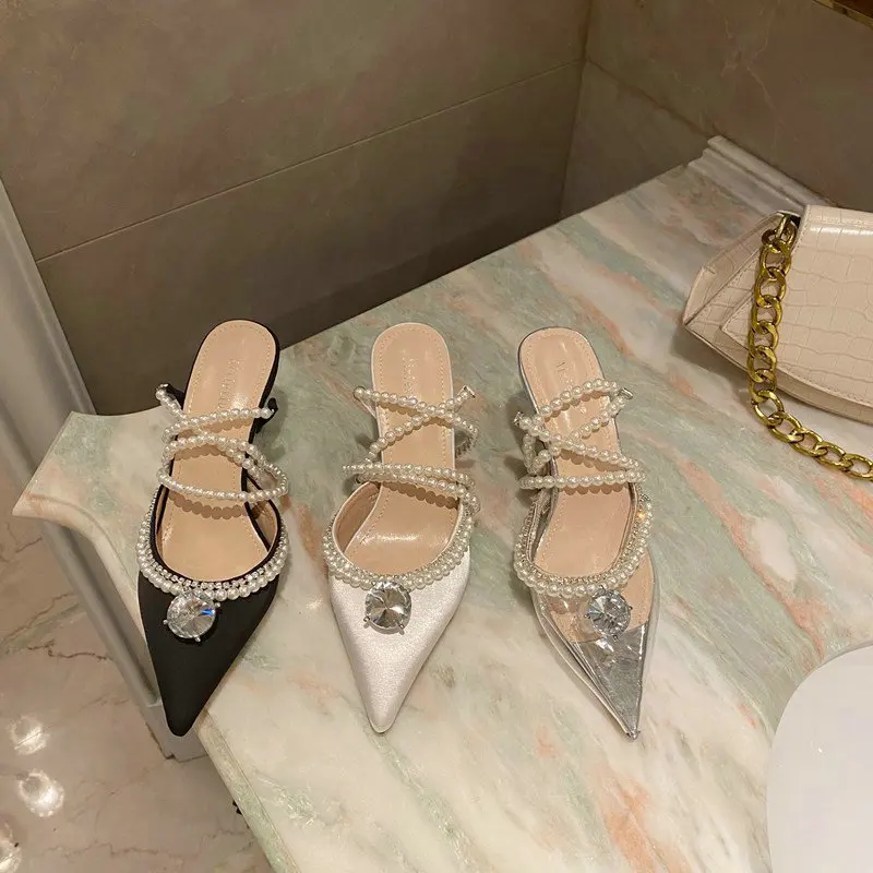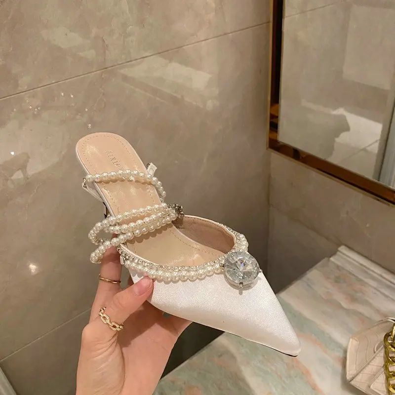 Новинка Весна 2022, женские босоножки, универсальные туфли на шпильке с острым носком и искусственным жемчугом на среднем каблуке, обувь на высоком каблуке
