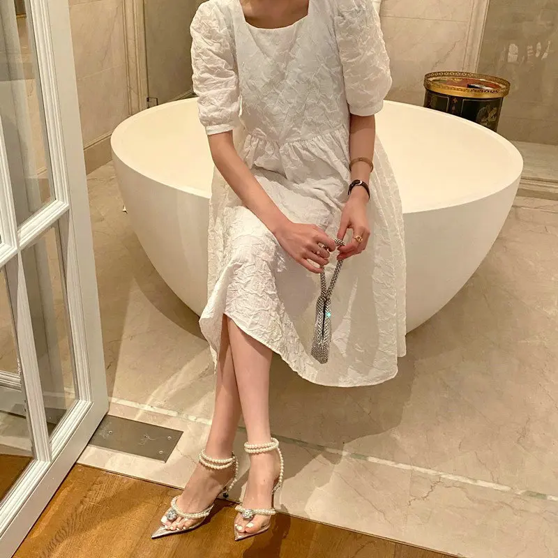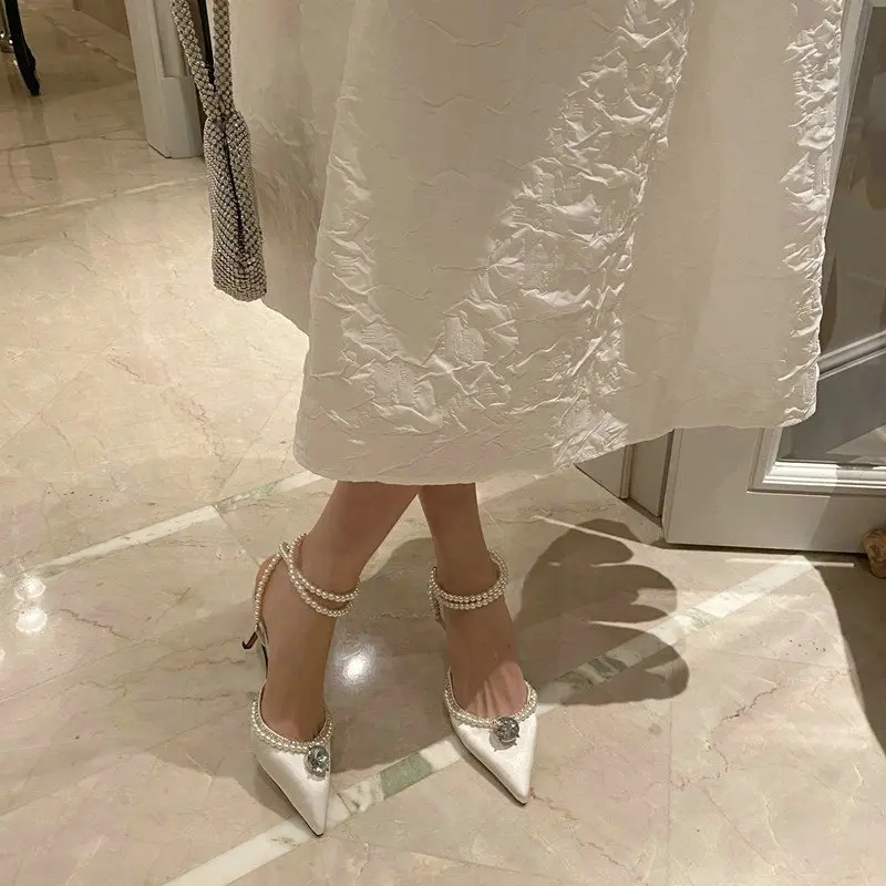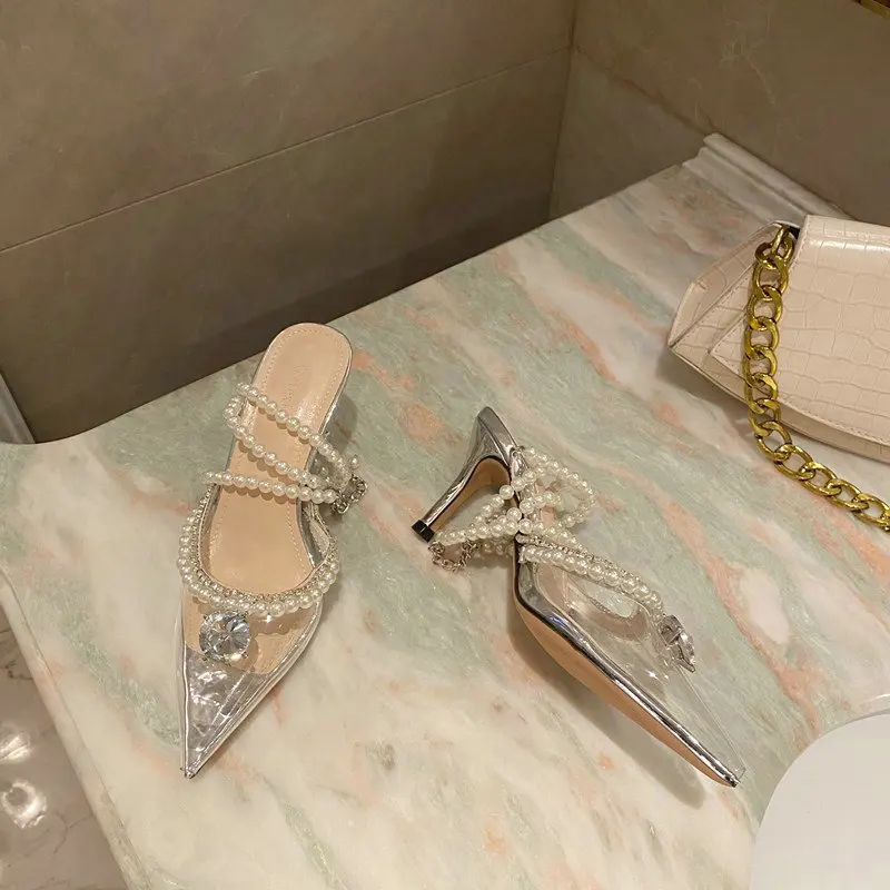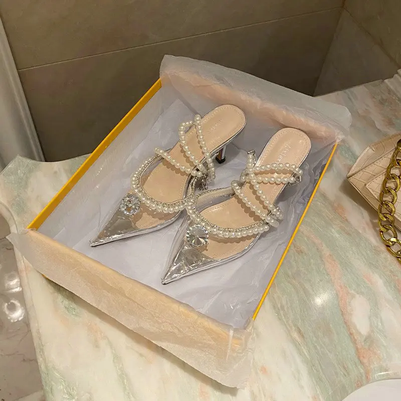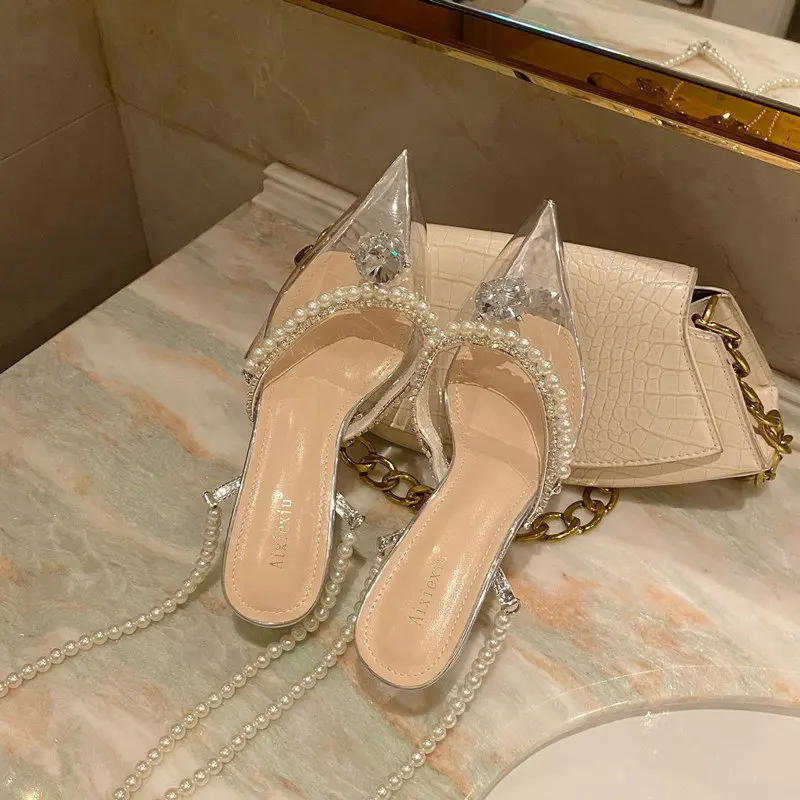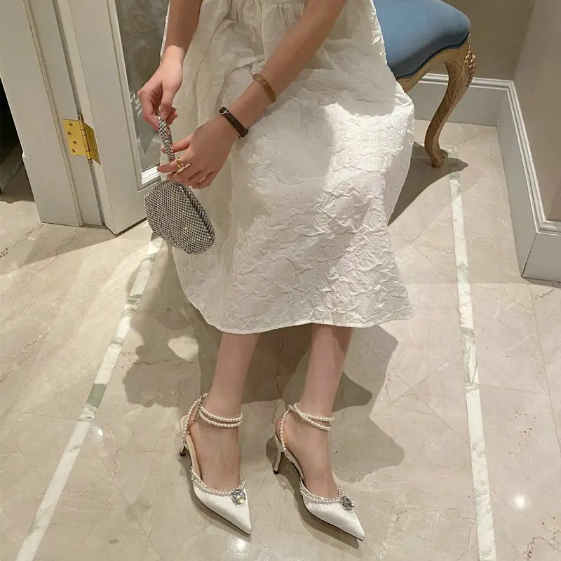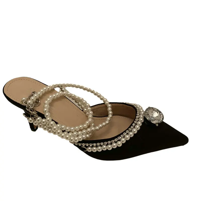 Новинка Весна 2022, женские босоножки, универсальные туфли на шпильке с острым носком и искусственным жемчугом на среднем каблуке, обувь на высоком каблуке