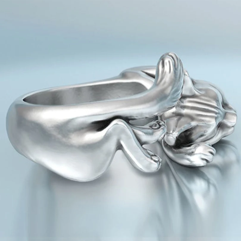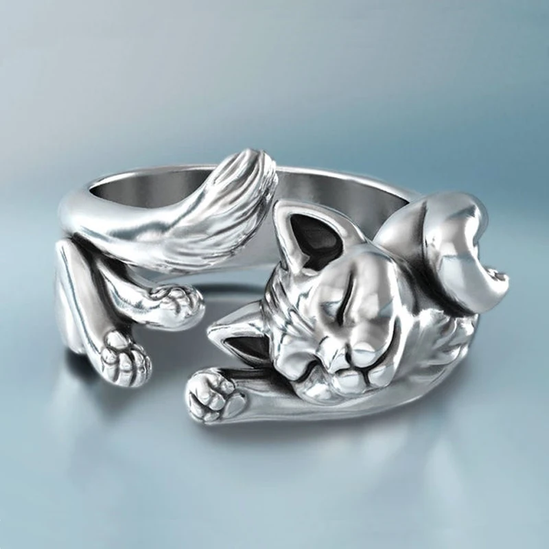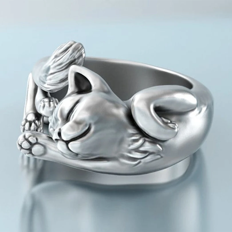 Регулируемое кольцо для мужчин и женщин, винтажное открытое ювелирное изделие серебристого цвета с изображением ленивого спящего котенка, для свадебной вечеринки, ювелирные аксессуары