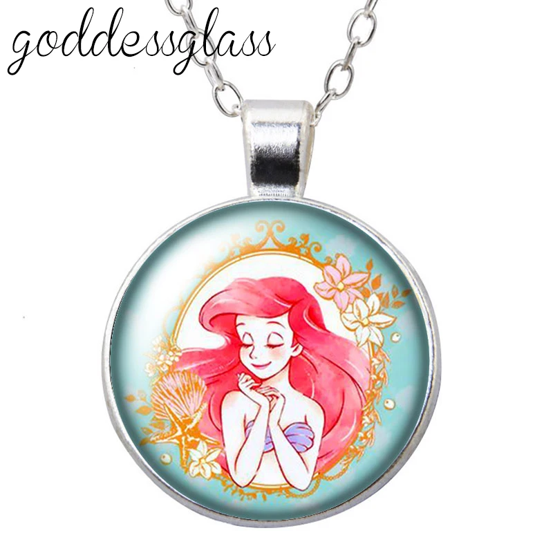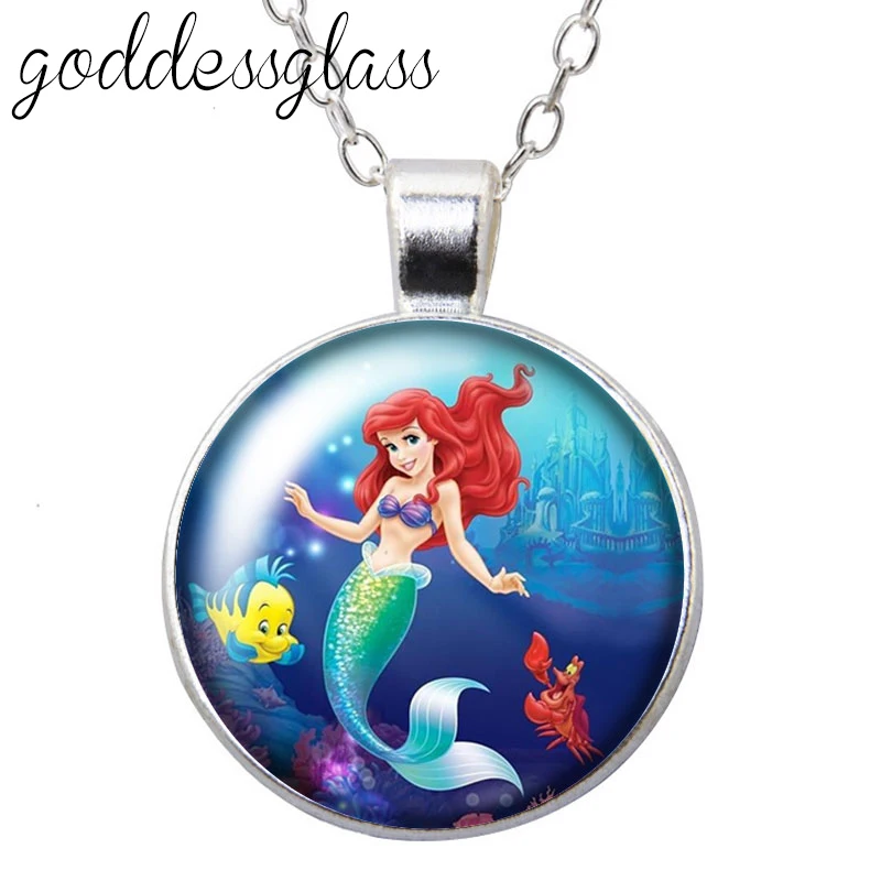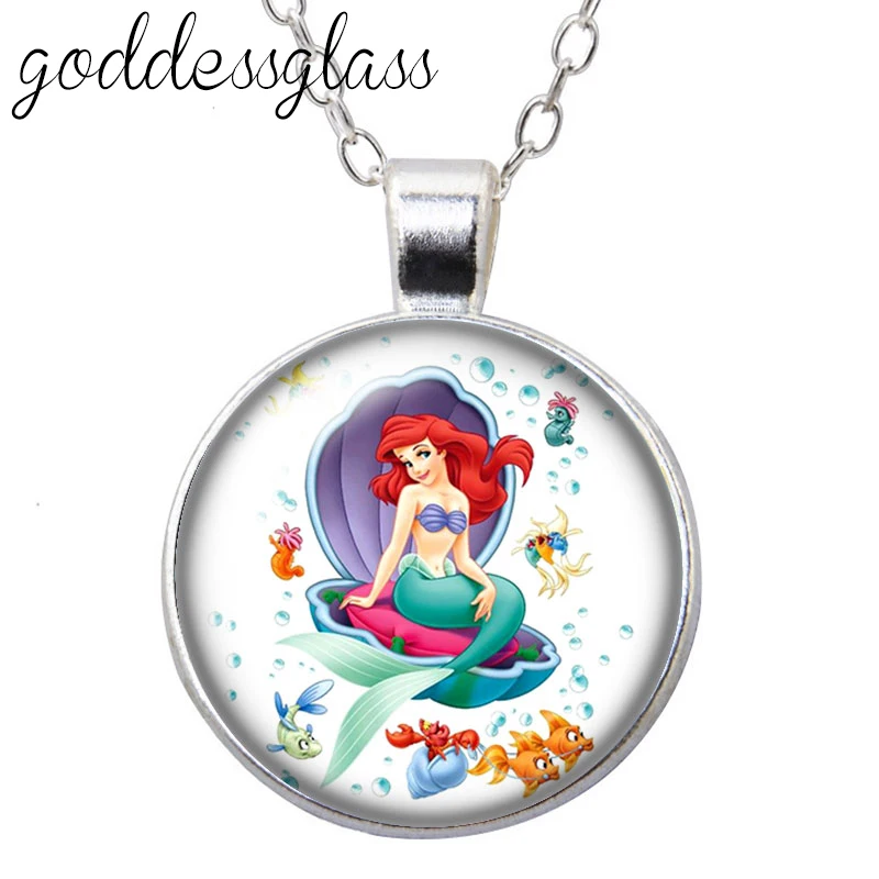 Ожерелье с подвеской маленькая русалочка из Диснея Ариэль, Круглое стекло, кабошон с серебряным покрытиемкристаллами, ювелирные изделия в подарок
