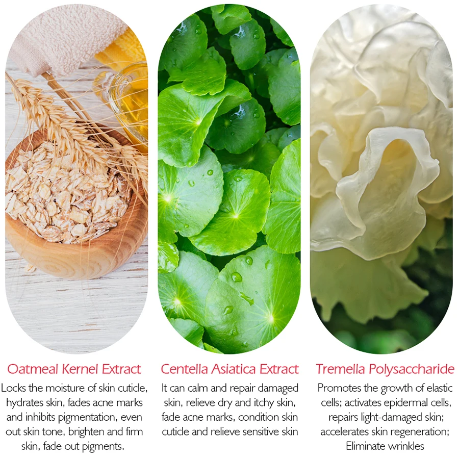 Вода, глицерин, пропиленгликоль, экстракт листьев алоэ BARBADENSIS, Tremella (TREMELLA FUCIFORMIS), полисахарид, Овсянка (AVENA SATIVA) экстракт ядра, центелла Asiatica (C[NTCLLA ASIATICA), экстракт Никотинамид, транexamная кислота, 3-о-этиласкорбиновая кислота, ß-глюкан, керамид I, липид кожи животных, а-арбутин, бис (гидроксиметил) имидазолидинил мочевина, лопропирпирбутин натрия, натрий динатрия EDTA