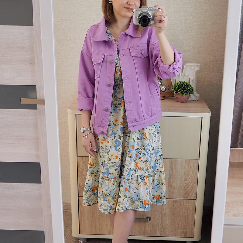 Куртка джинсовая женская демисезонная, фиолетовая, белая, размера п...