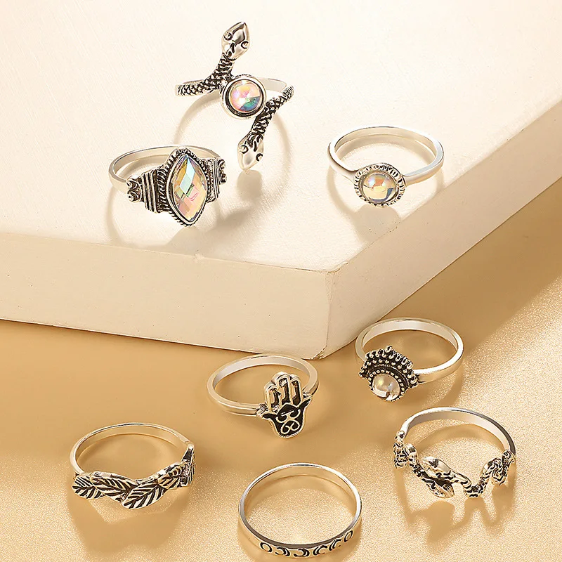 8 шт.компл. богемный винтажный Набор геометрических колец в виде листа змеи с кристаллами, модные пляжные кольца для женщин, ювелирные изделия, аксессуары