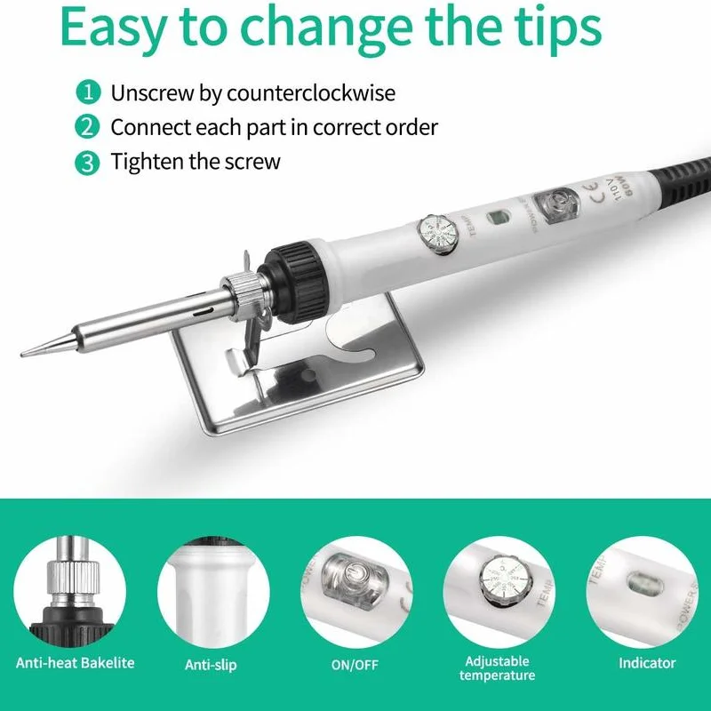 1: комплект паяльника поставляется с кнопкой включения питания и кнопкой регулировки температуры, поэтому его можно свободно и легко включать/выключать или регулировать нужную вам температуру. 2: изготовлен по японской технологии точной печати, а комплект для пайки может спечиться при высокой температуре и сохранять длительное использование. 3: Если вы хотите научиться паять, этот стартовый набор для паяльника идеально подходит для ваших нужд. Это очень удобно и компактно. 4: нескользящая Мягкая резиновая ручка для максимального комфорта и безопасной пайки.