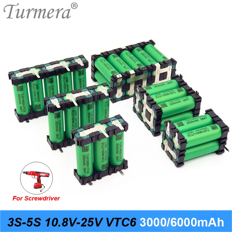 Turmera 3S 12,6 V 4S 16,8 V 5S 21V VTC6 батарея 3000mAh 30A батарея TUR18650-VTC6 держатель для 12V 18V отвертка батареиОписание товара:Батарея tu \ rmeraМодель: 3S 12,6 V 4S 16,8 V 5S 18V 6S 25V 18650-VTC6 аккумуляторНоминальное напряжение: 3S 10,8 V/4S 14,4 V/5S 18V/6S 21,6 VЗарядка Напряжение: 3S 12,6 V/4S 16,8 V/5S 21V/6S 25,2 VЕмкость аккумулятора: 1P 3000mAh / 2P 6000mAhТок разряда: 30AТурмераПрименение: 12V 16,8 V 18V 21V Shura, отвертка, батарея shurik и 3S 4S 5S 6S аккумулятор.Упаковочный лист: Доставка по выбору разных комплектов.