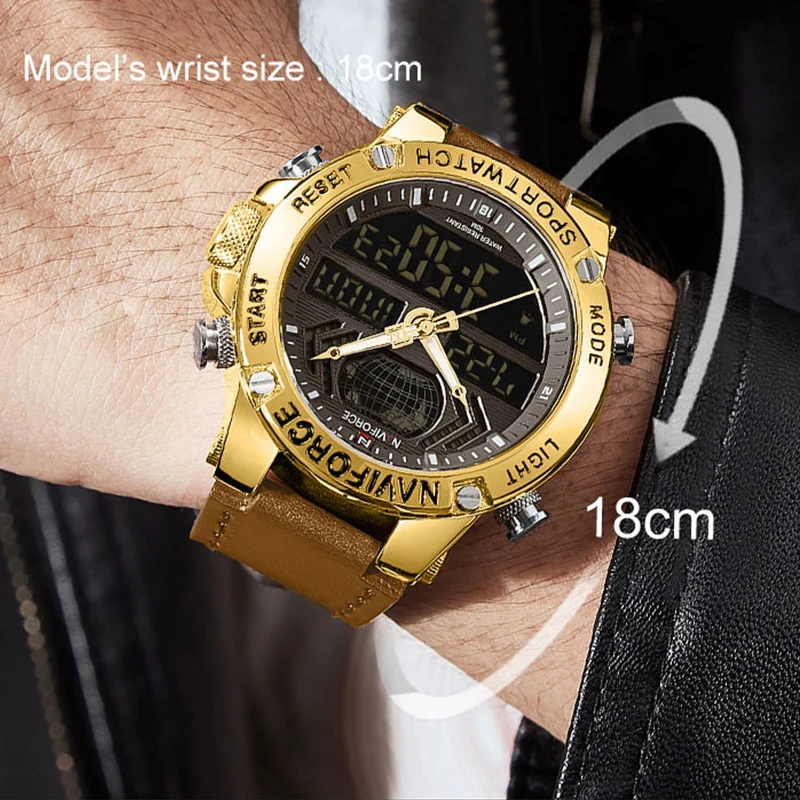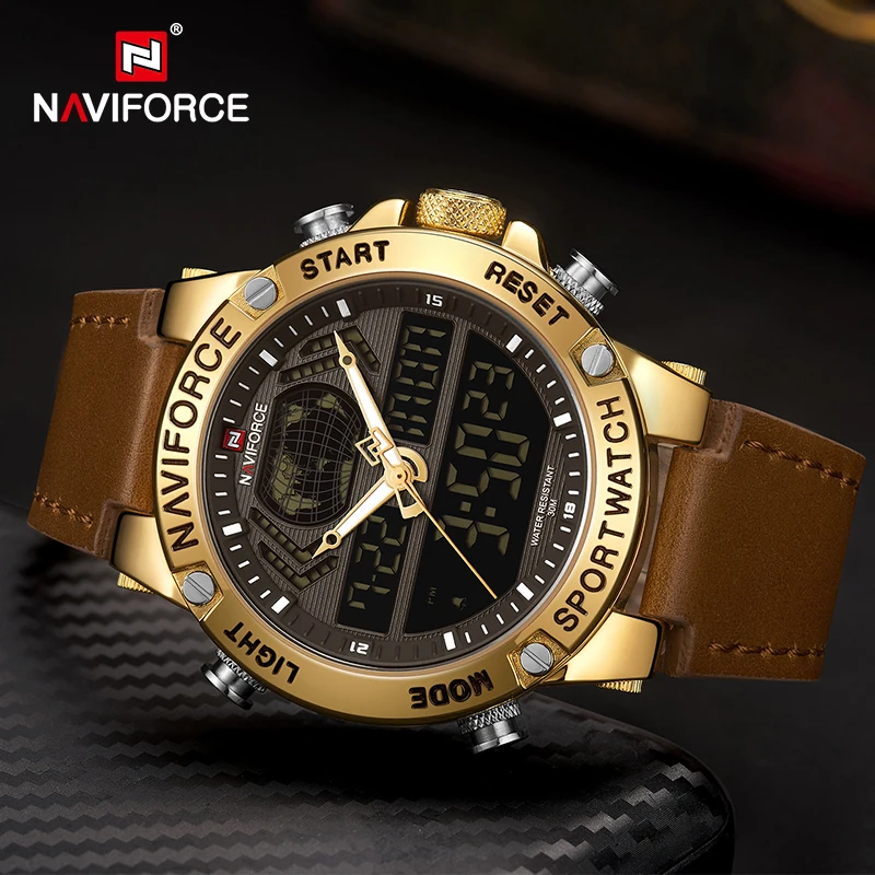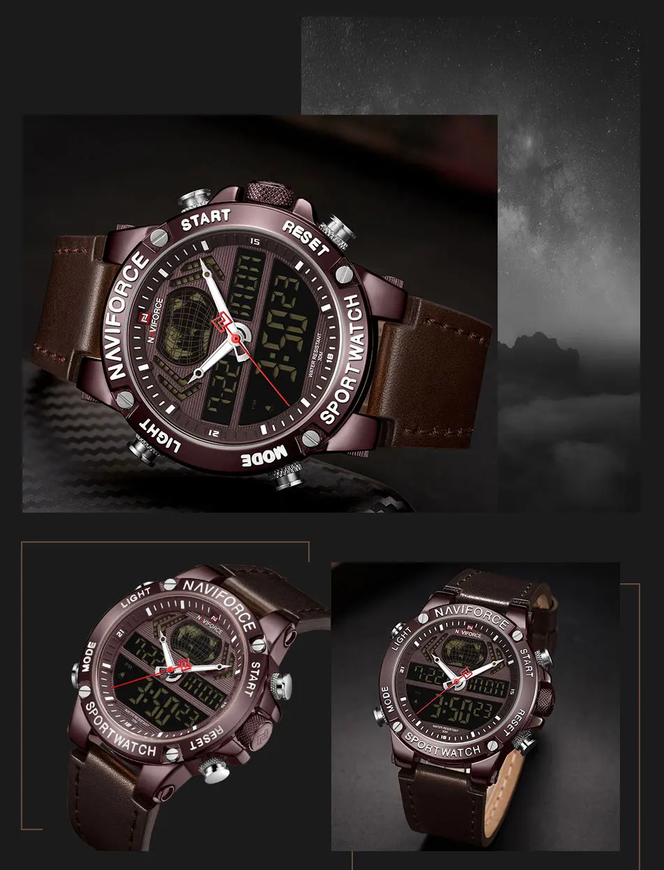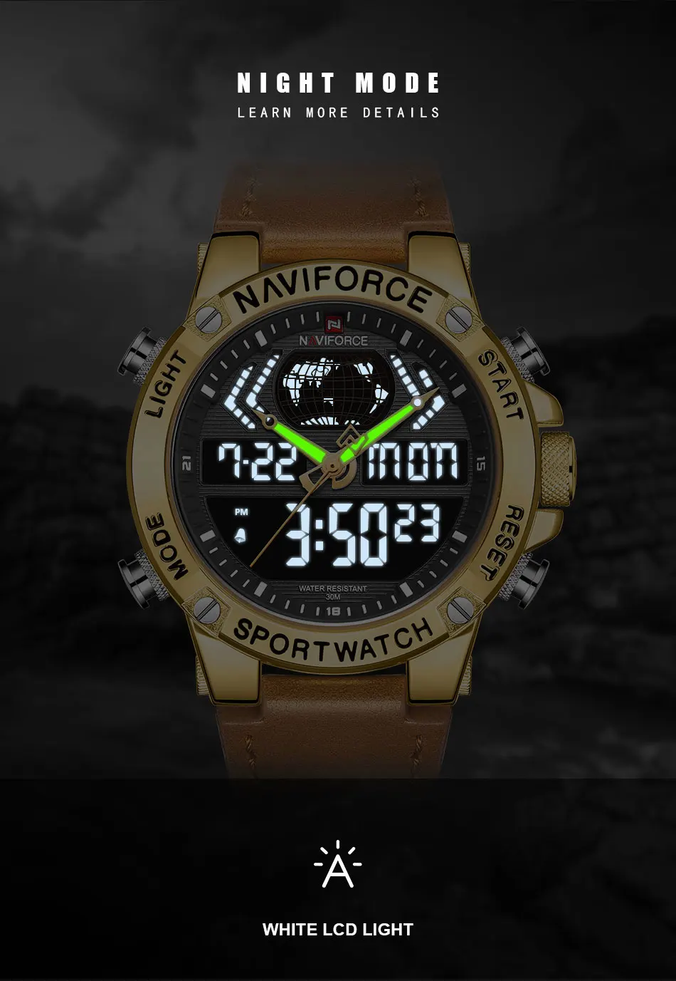 Часы наручные NAVIFORCE мужские светодиодные, брендовые роскошные Цифровые Аналоговые спортивные в стиле милитари, с ремешком из натуральной кожи