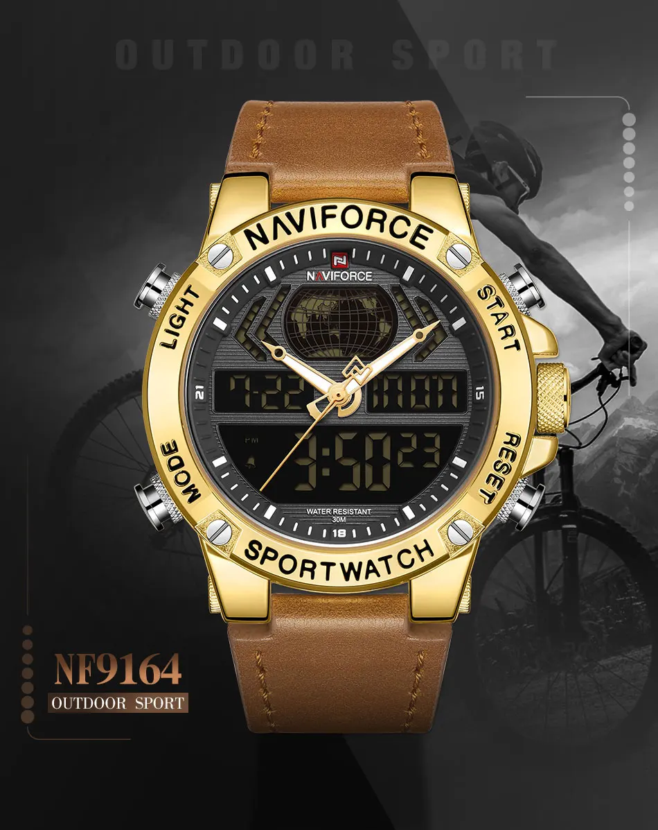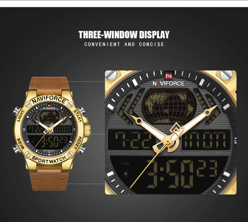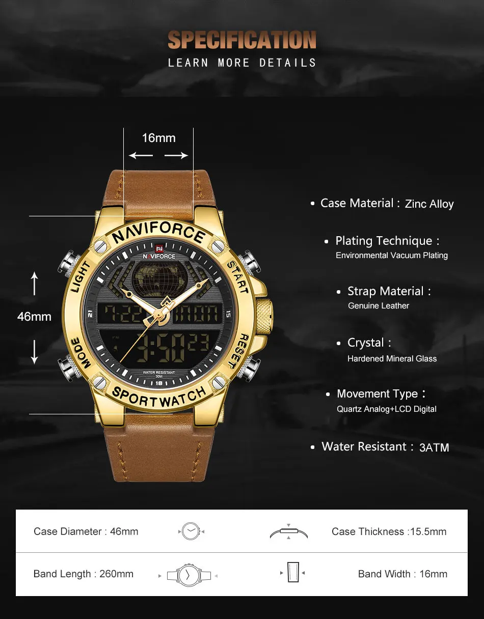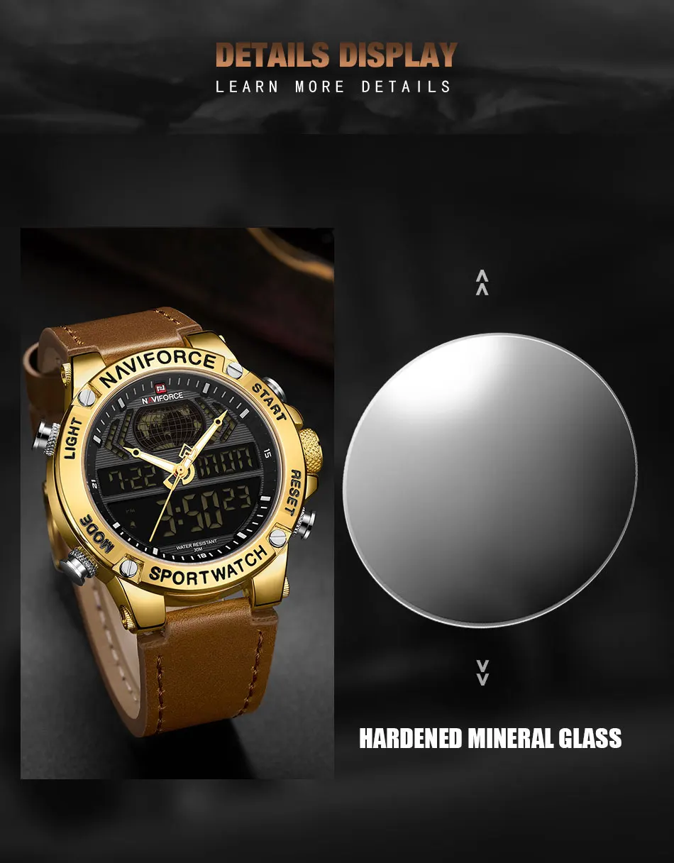 Часы наручные NAVIFORCE мужские светодиодные, брендовые роскошные Цифровые Аналоговые спортивные в стиле милитари, с ремешком из натуральной кожи